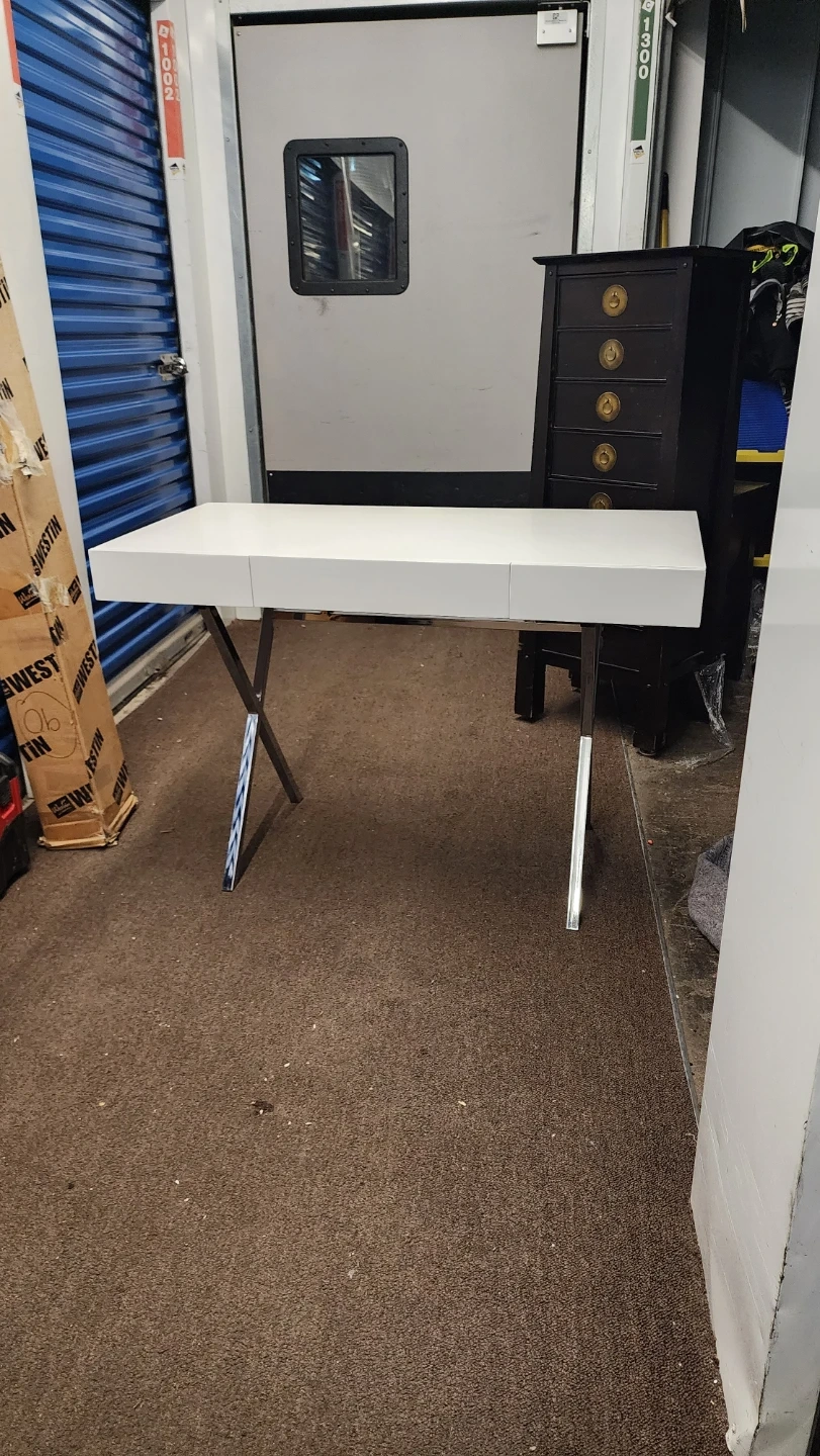 67Selling a sleek white desk with chrome legs. It's in great condition and would be perfect for a home office or study space. Has a couple of drawers for storage too!