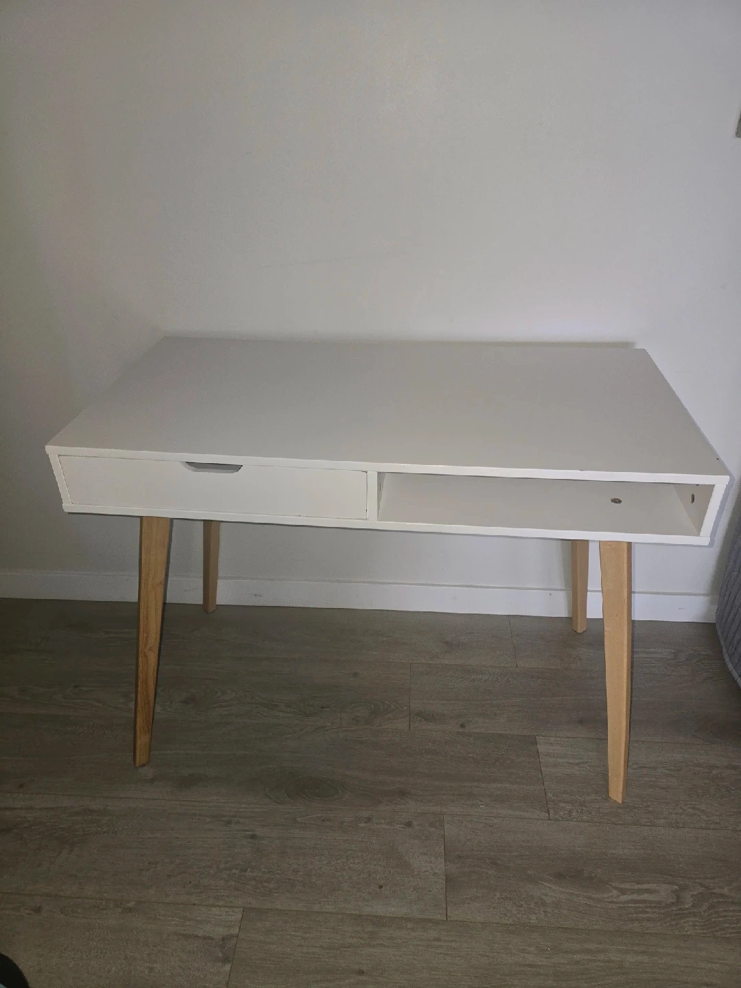 60Selling a simple computer white desk with a drawer and wooden legs. It has some minor wear and tear on the edges as shown in the photos. Dimensions: - 100cm / 39.4in wide - 50cm / 19.7in deep - 77cm / 30.3in high