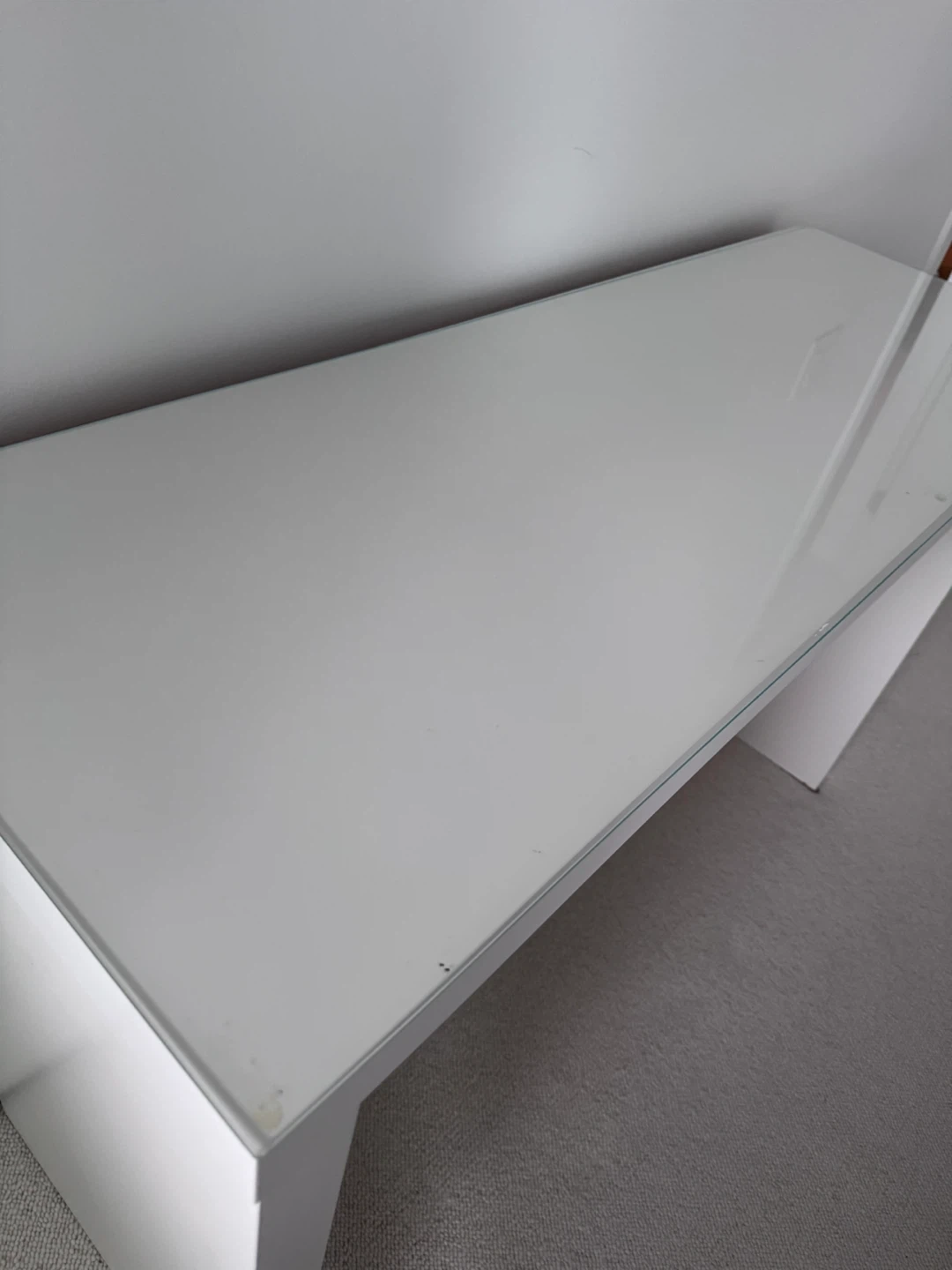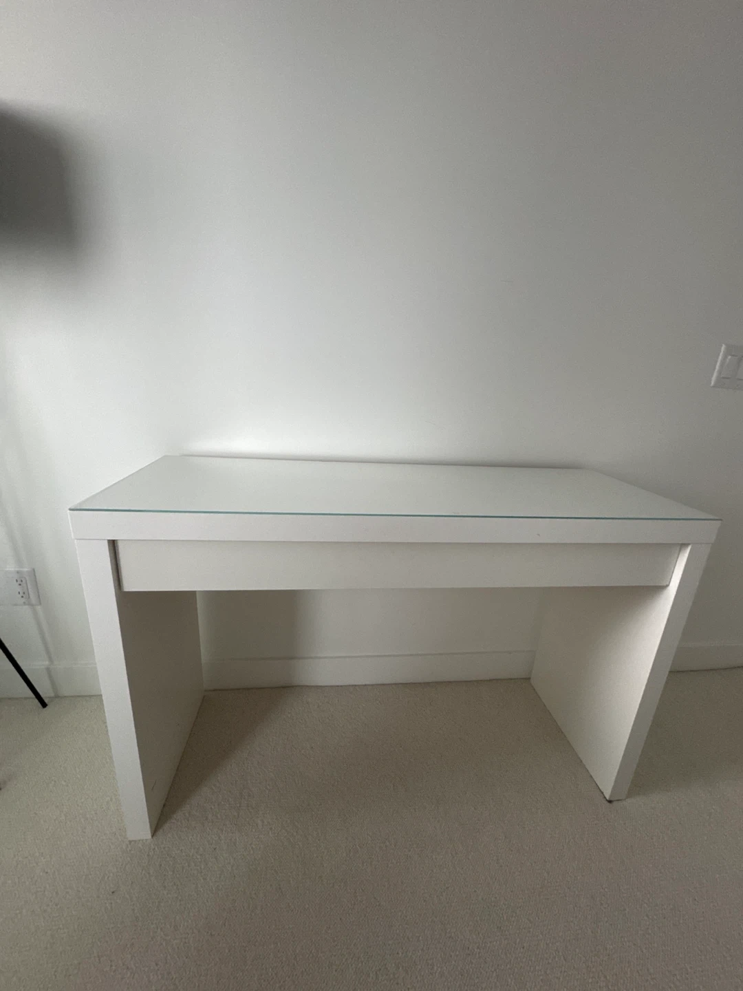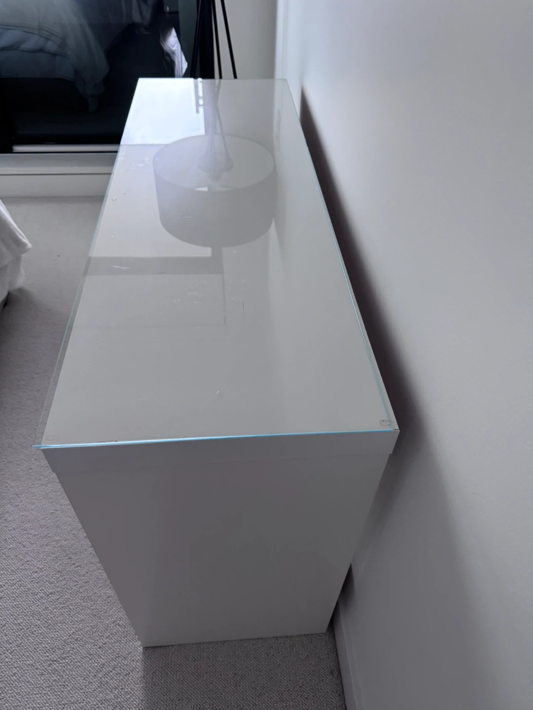 75Selling a White Ikea make up dresser/desk with a glass top! It's in good condition and would be perfect for a home office or study space. It has a clean, modern look that would fit well with any decor. There are a couple of minor scratches on the surface and inside but they can be easily covered with white paint. This desk is sturdy and ready for a new home!