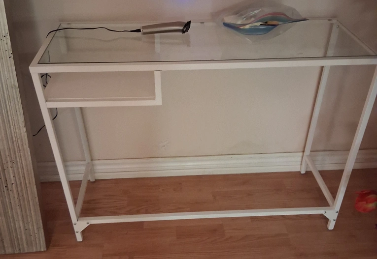 Selling a simple white desk with a glass top. It's in great condition and would be perfect for a small office space or student. The desk features a minimalist design with clean lines and a small shelf on one side. Have 2 for sale.