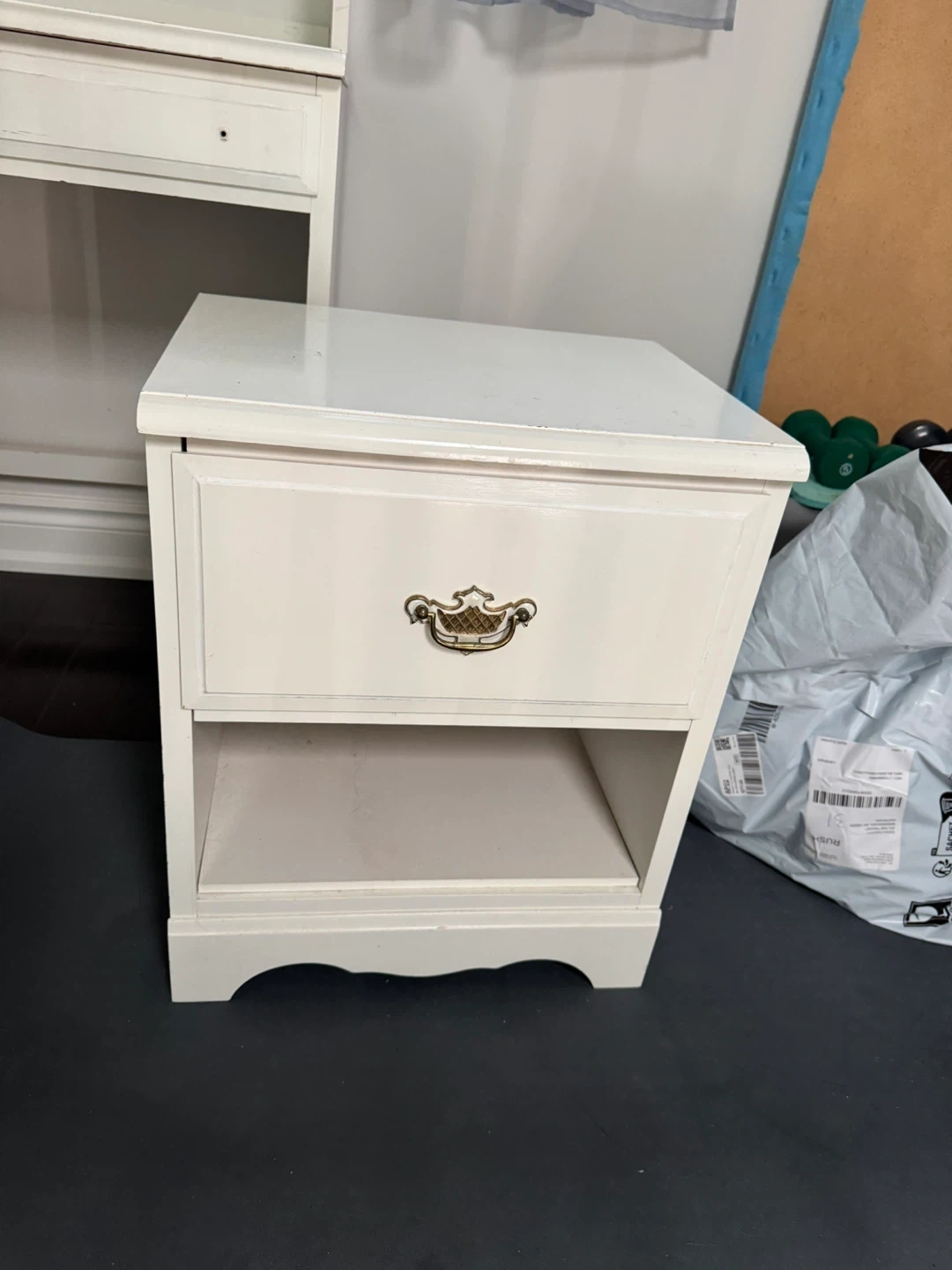 Gorgeous solid wood set featuring classic dovetail craftsmanship — built to last (definitely not IKEA!). The desk includes a charming, removable hutch with plenty of storage, and the matching bedside table completes the look perfectly. Paint shows a few character nicks that add to its vintage charm, but overall the set is in excellent condition. A timeless addition to any bedroom or home office!