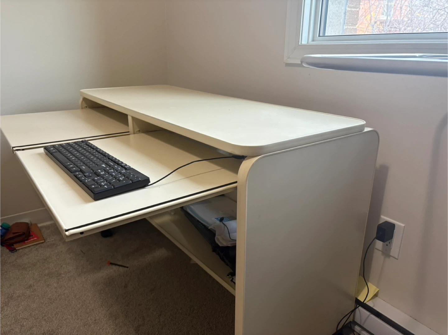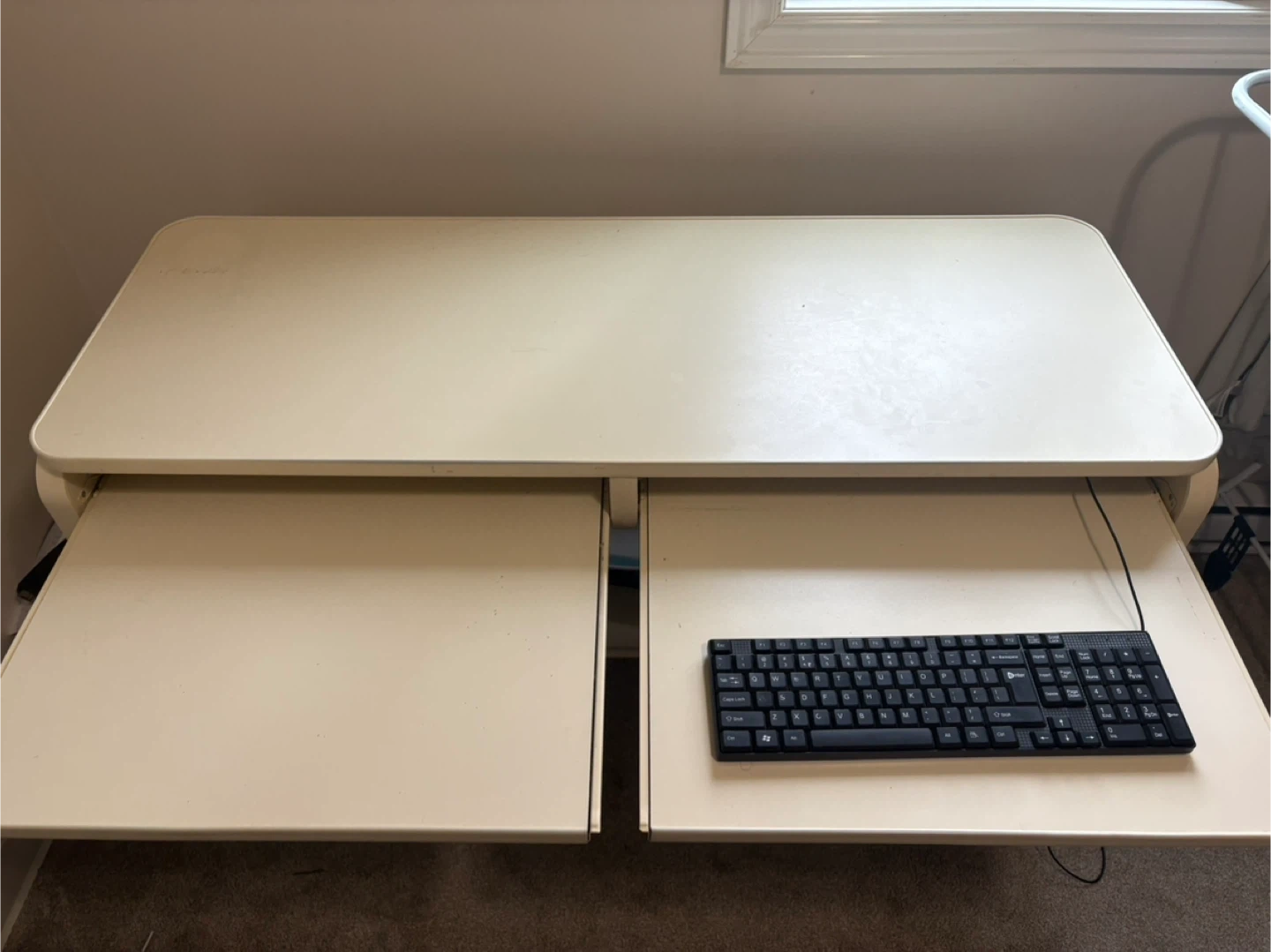 60Selling a white desk that's in great shape. It features two pull-out keyboard trays, perfect for maximizing space and keeping your workspace organized. It's a sturdy desk and would be great for a home office or study area