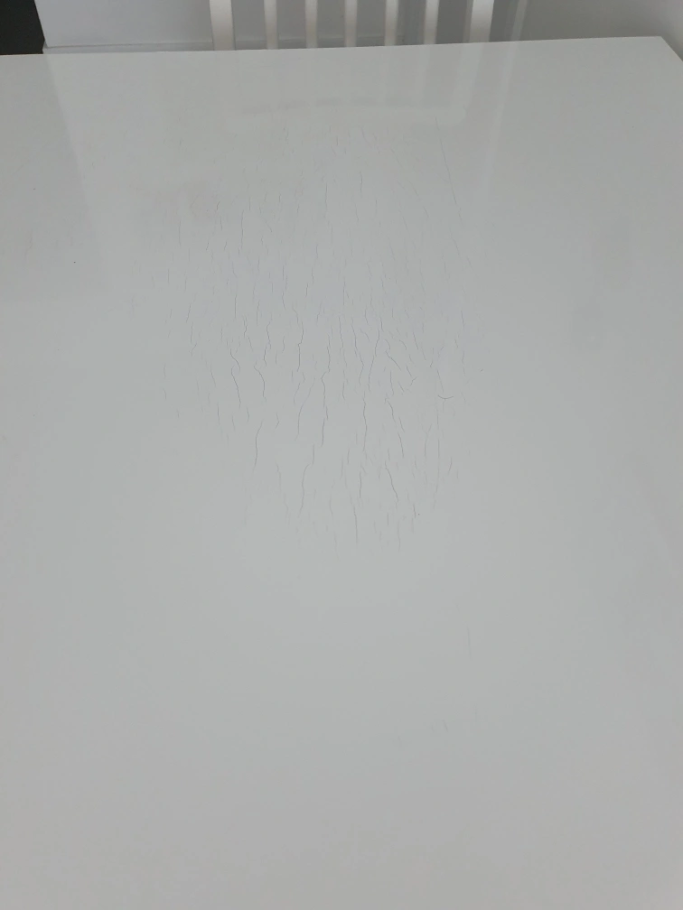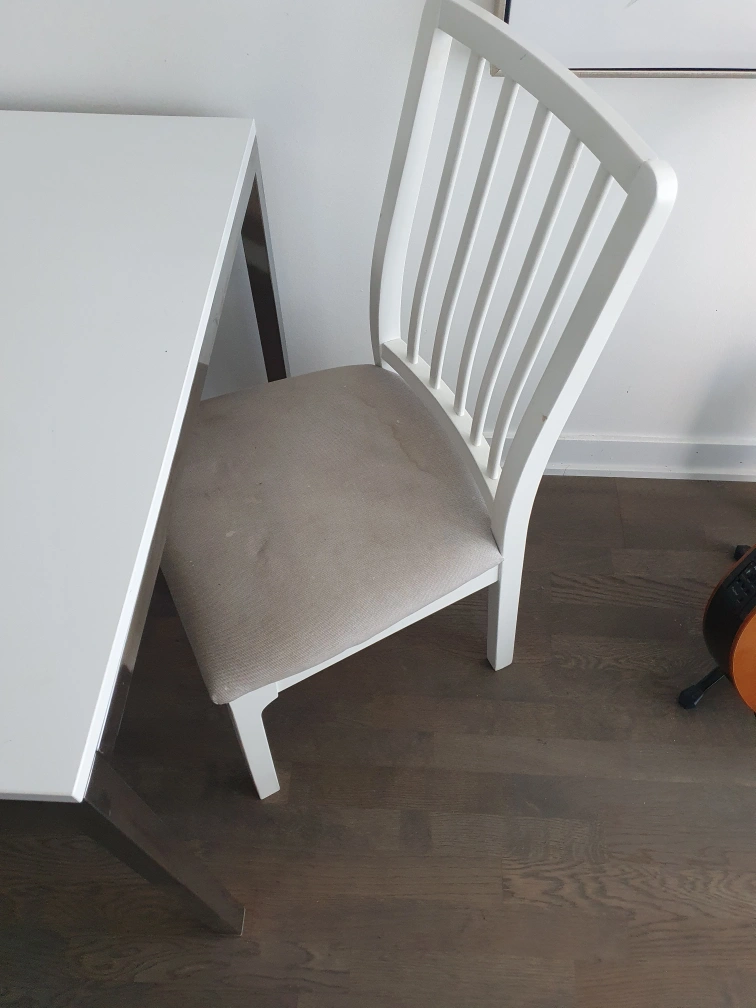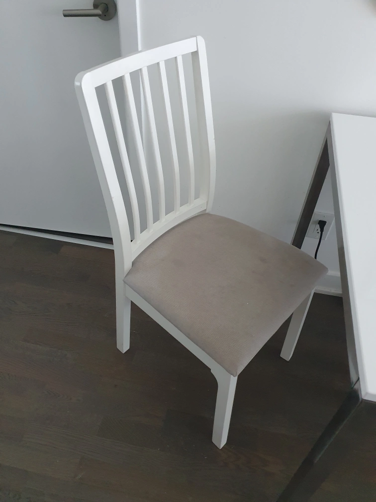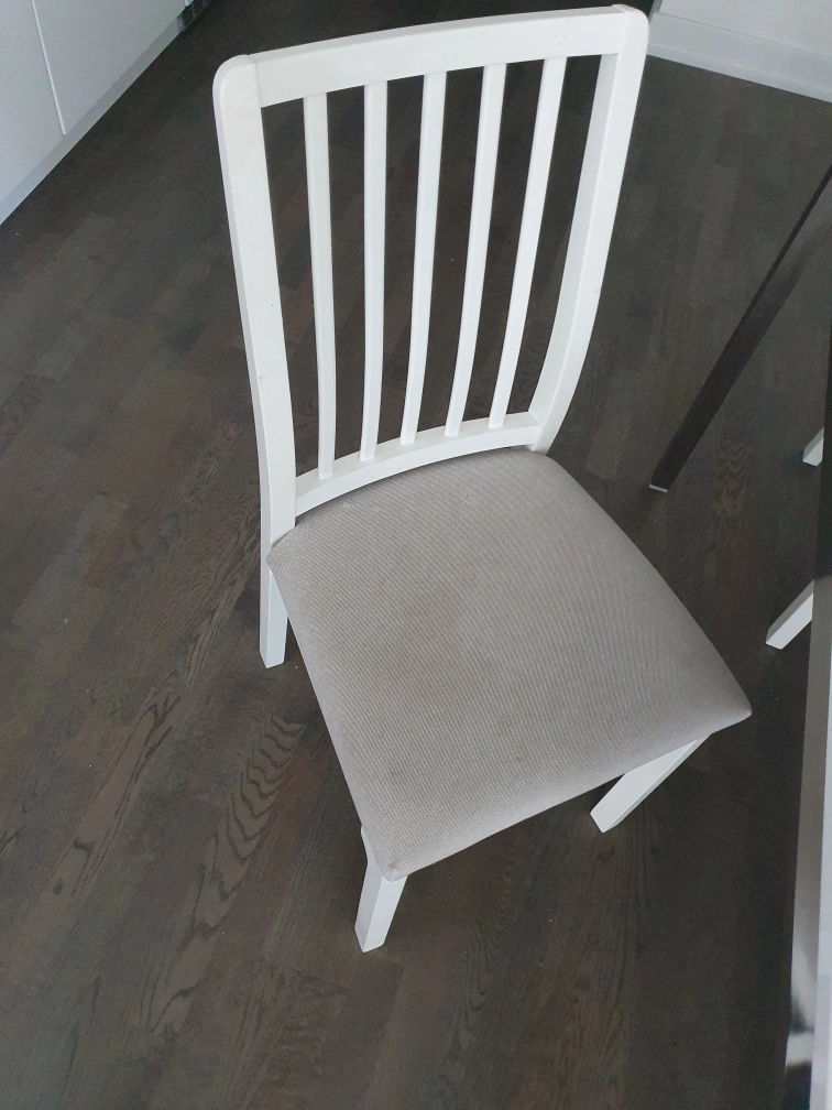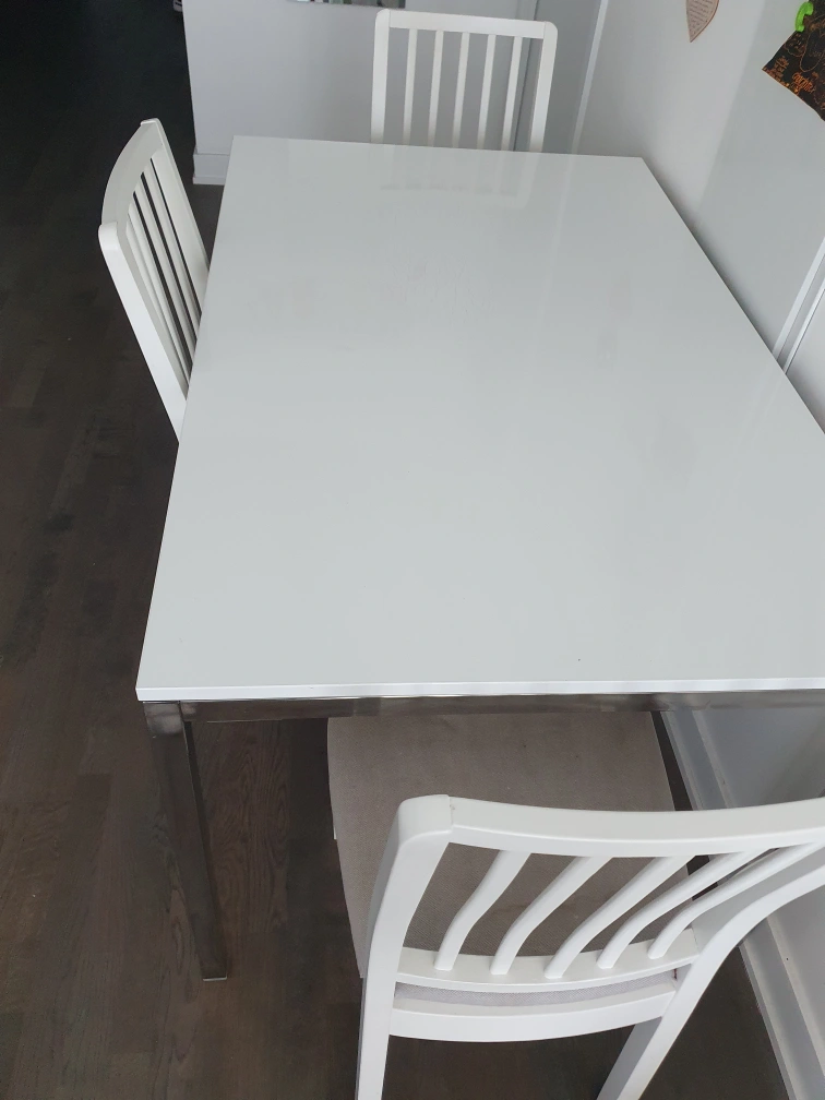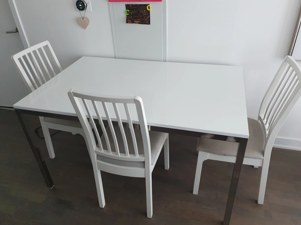 53White dining table with 3 chairs. The chairs are upholstered in a grey fabric few small stains butnin good condition. The table has a white laminate top with a chrome base. Some wear and tear on table top but othwrwise in great condition. Will sell the whole set for $80