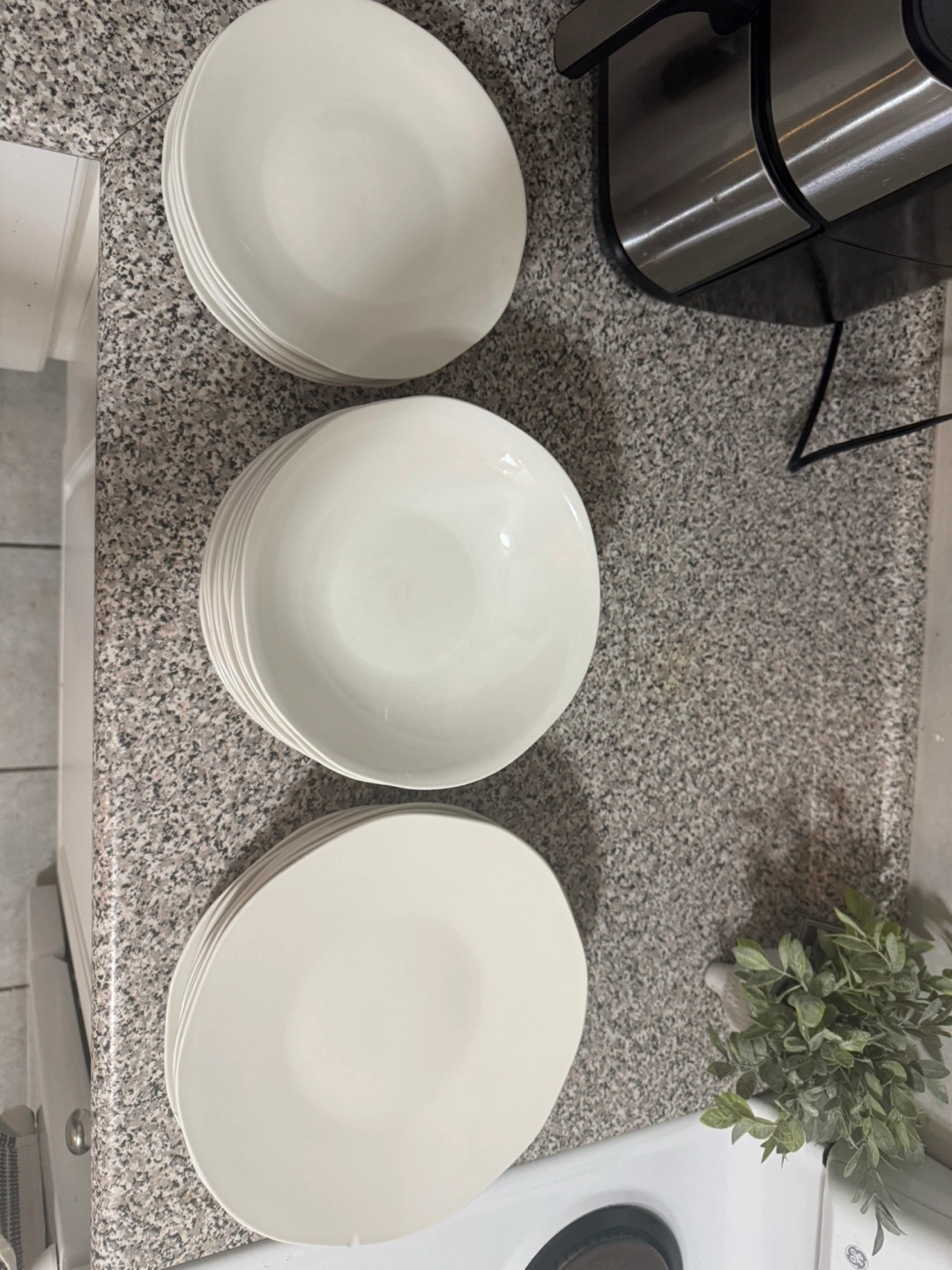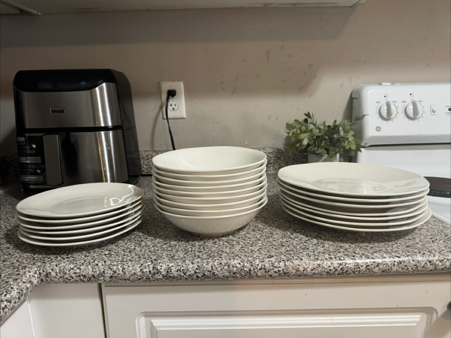 7 large and small plates and 9 bowls. Great quality - brand is Thompson Pottery Gently used, a few chips on some of the sides. Asking $40 OBO