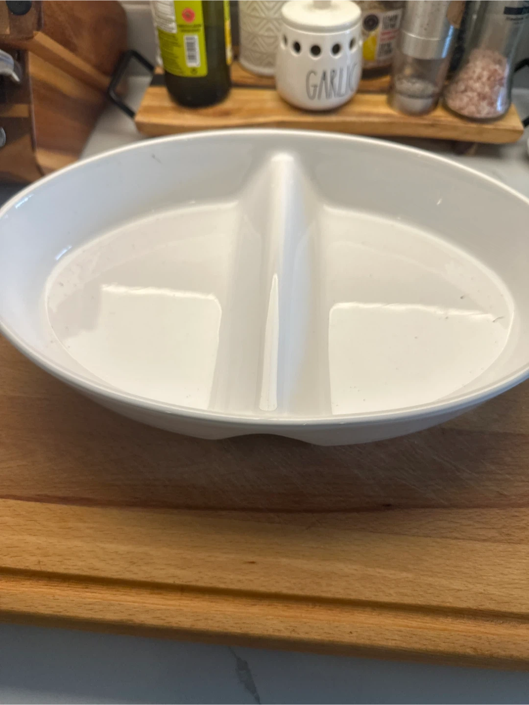Selling a white divided serving dish. It's perfect for serving snacks, appetizers, or dips at your next gathering. It is in great condition and ready for a new home!