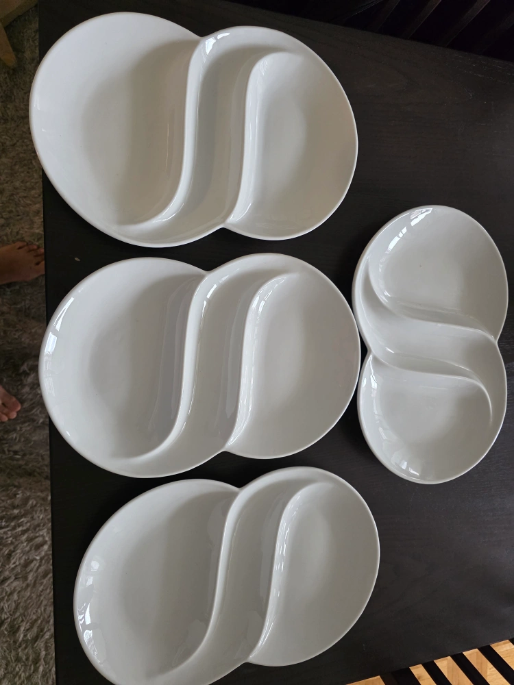 16Selling a set of four white serving dishes. They each have a divided section, perfect for snacks or appetizers! They're in great condition and ready for a new home