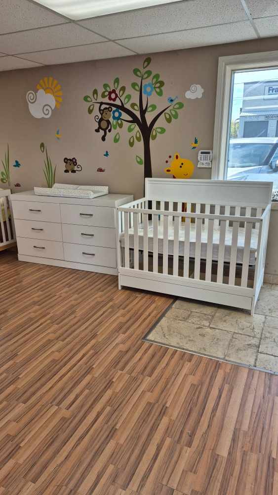 Selling a white dresser and crib set. Perfect for a nursery! The dresser has six drawers, offering lots of storage space. The crib is a standard size and in great condition. A great set for your little one's room. Crib mattress NOT included, available for 45$