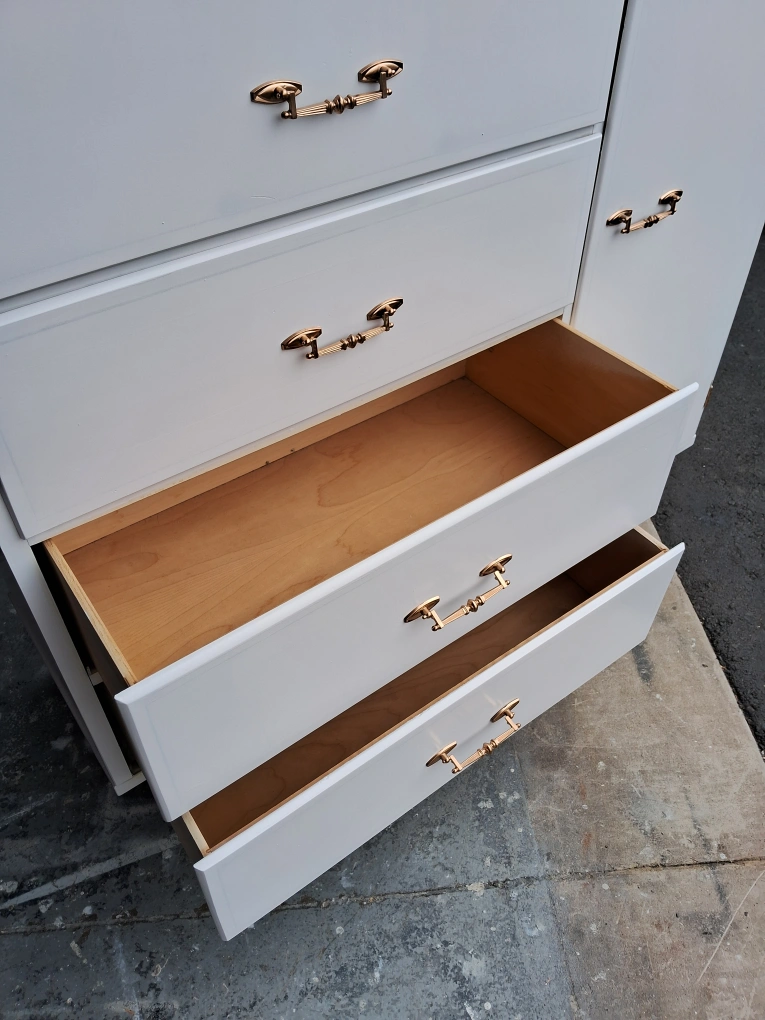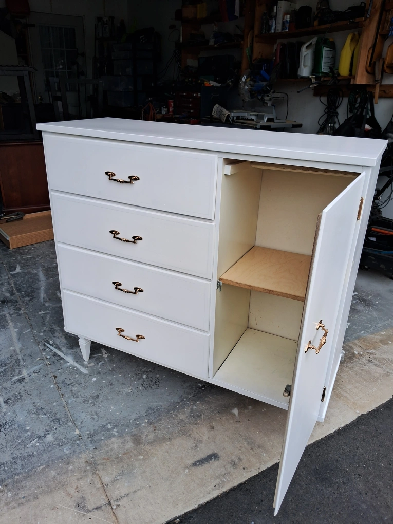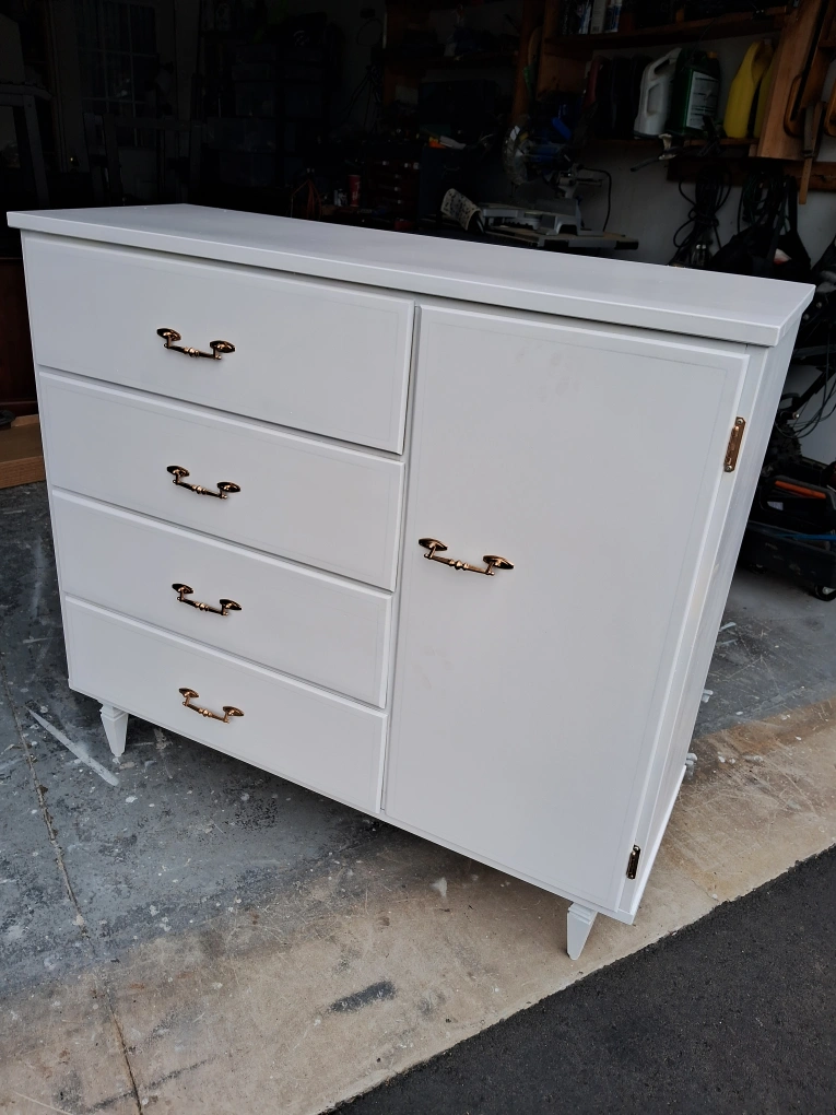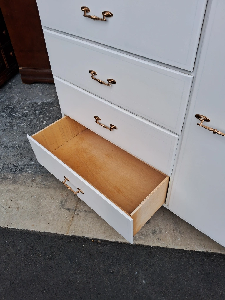 Selling a charming white dresser! It features four drawers and a cabinet with a shelf, perfect for organizing your clothes and belongings. The gold handles add a touch of elegance to this functional piece of furniture