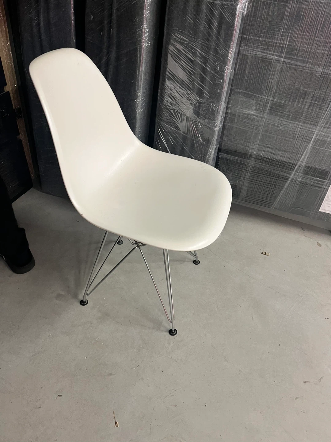 Selling a white Eames style molded plastic chair. This chair features a comfortable seat and a stylish design, perfect for any modern home. Its sleek look and durable construction make it a great addition to your living room, dining area, or office