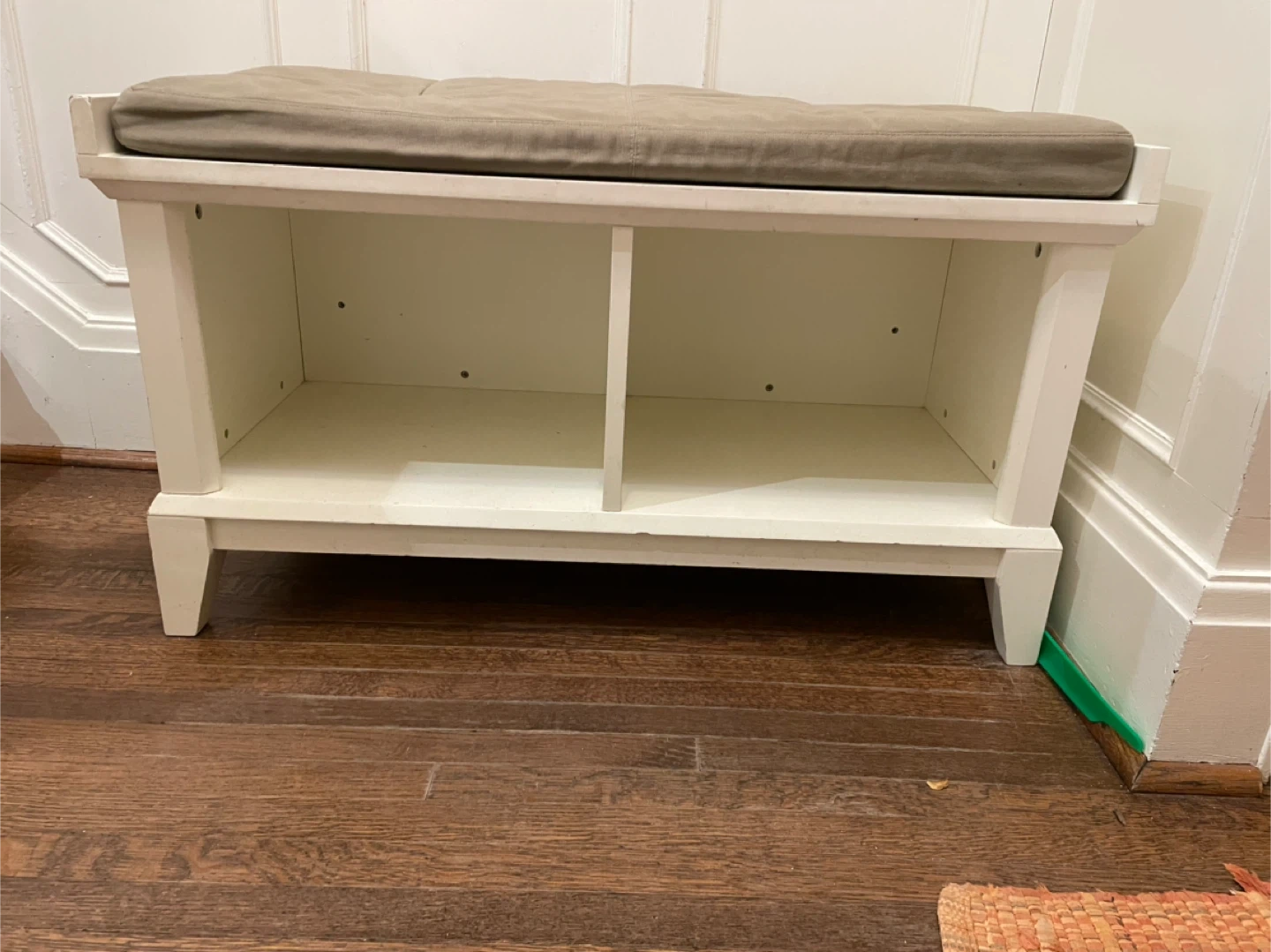153This is a lovely little entryway bench! It's perfect for storing shoes or other items, and the cushion makes it comfortable to sit on while you're putting on your shoes. It's in great condition and ready for a new home. Purchased from Crate and Barrel.