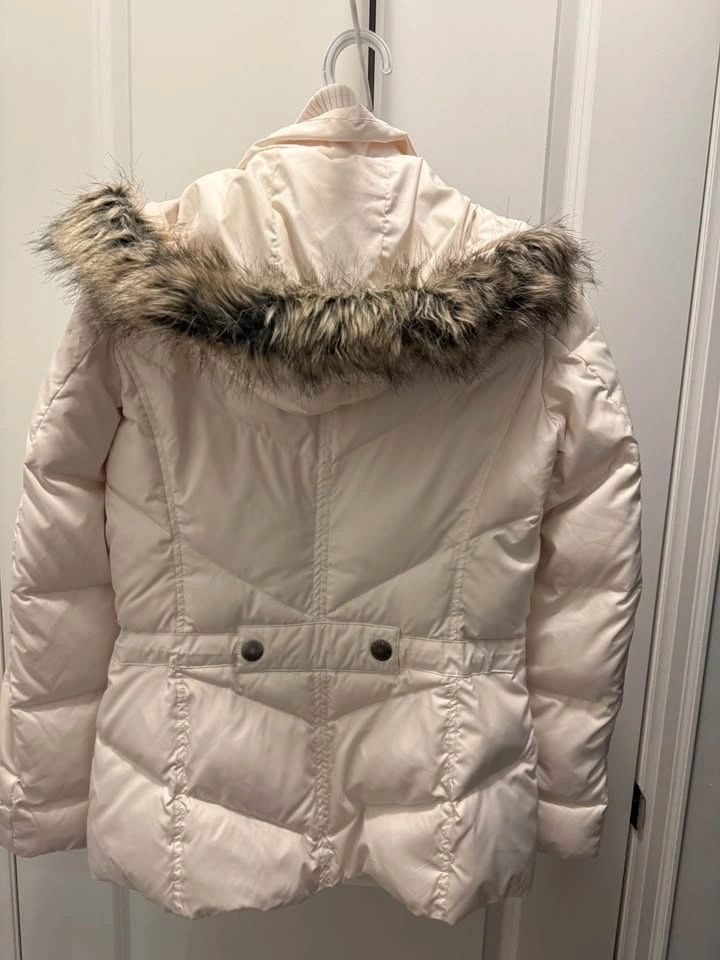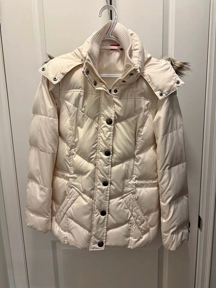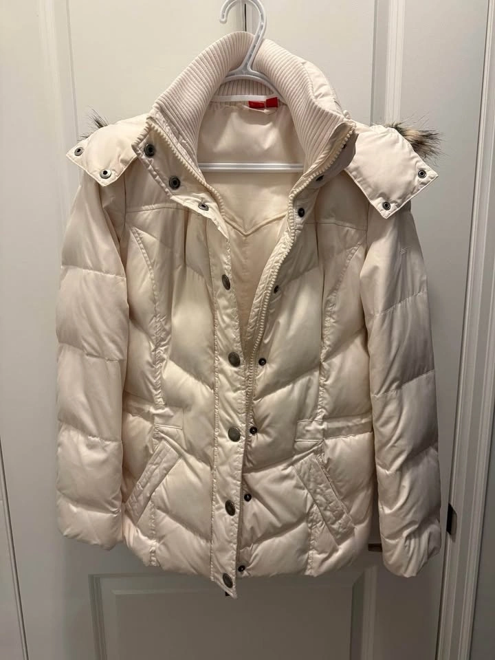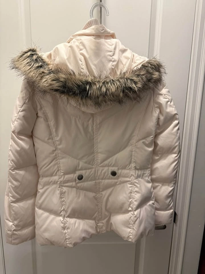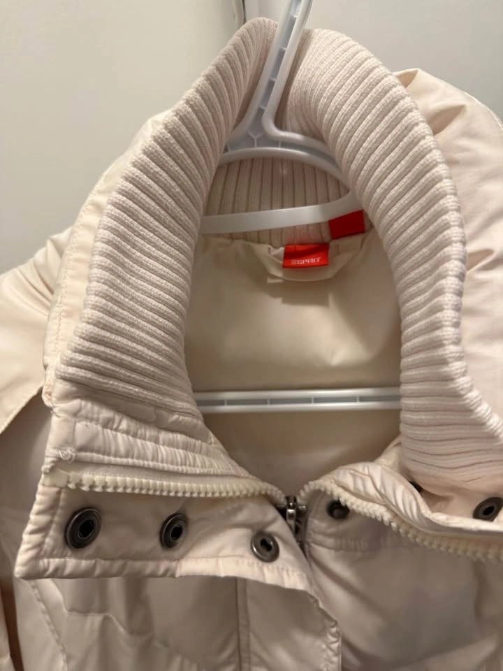78Size S - White puffer jacket with fur-trimmed hood and snap buttons. Has a red tag with 'ESPRIT' on the inside. Good condition, no damage.