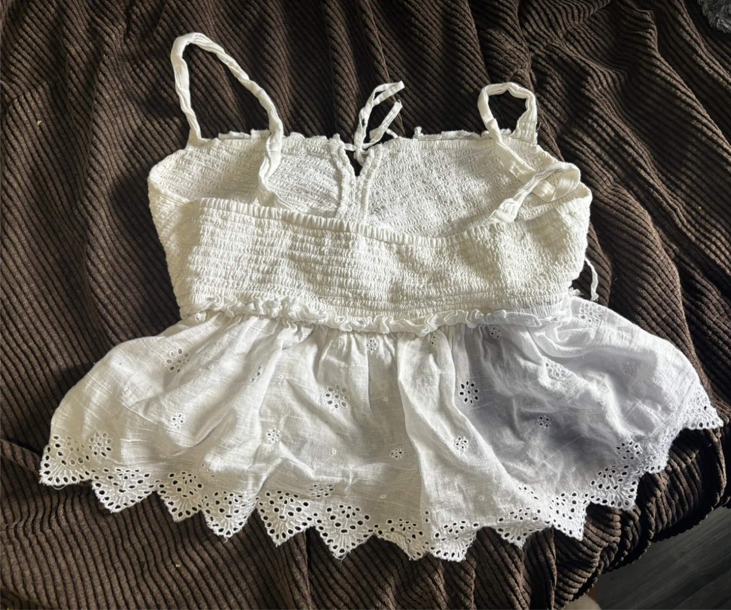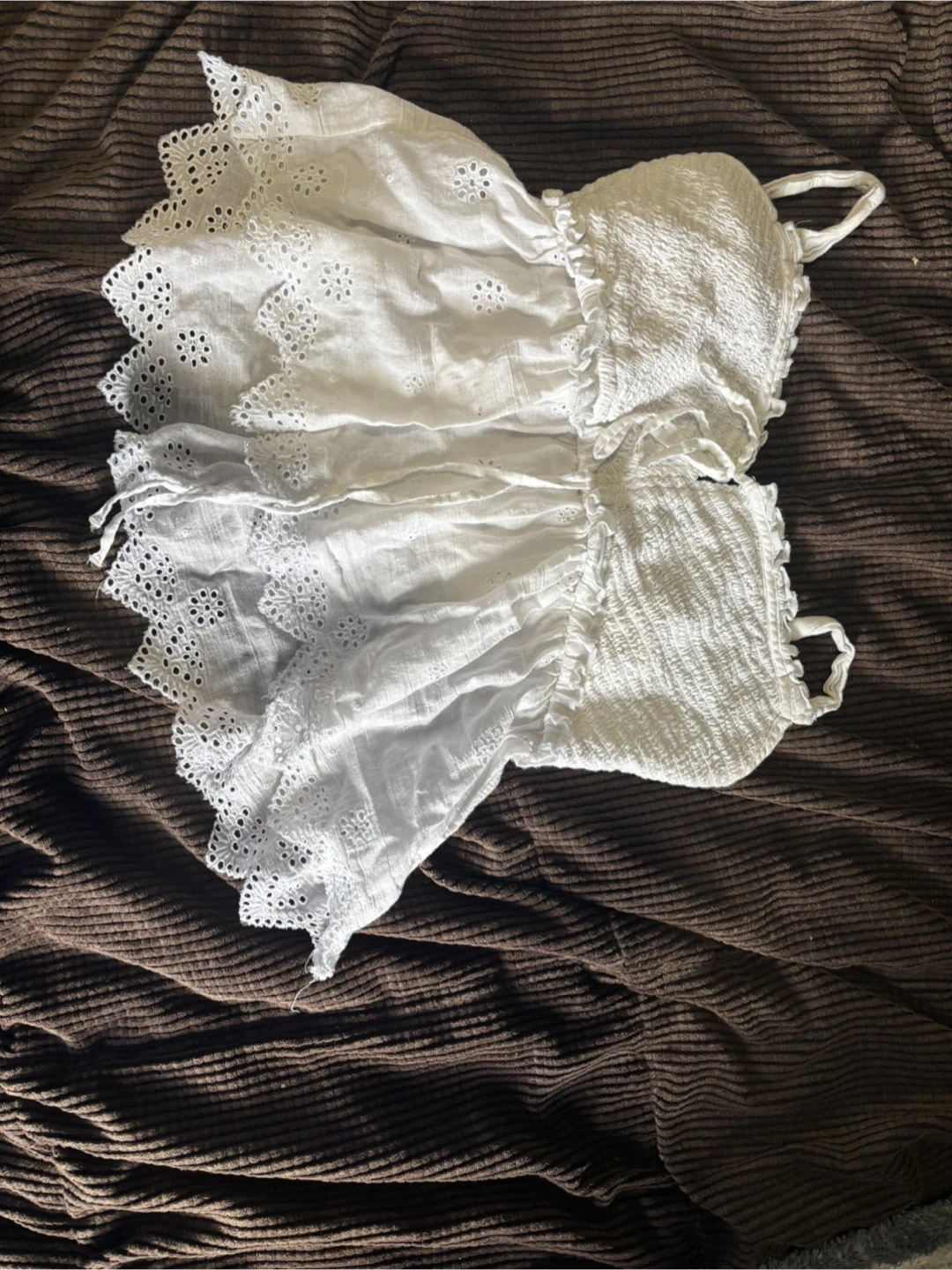 Selling a cute white tank top with eyelet detailing. It features a smocked bodice and adjustable straps! Only worn twice