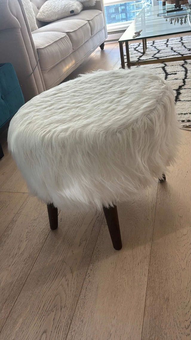 Bring texture and style into your space with this white faux-fur ottoman, perfect as a footrest, accent stool, or decorative piece. The soft, shaggy faux-fur upholstery adds warmth and luxury, while the solid wooden legs provide sturdy support and a mid-century inspired touch. This piece works beautifully in bedrooms, living rooms, vanity corners, or reading nooks — adding that cozy, modern-boho vibe to any setting. Features: • Plush white faux-fur upholstery (soft and comfortable) • Sturdy dark wooden legs • Lightweight and easy to move • Ideal as a footrest, vanity stool, or decorative accent Condition: Excellent — clean and well maintained, no stains or damage. Dimensions (approx.): Height: 17” Width: 18” Pickup in: Burnaby / Metrotown area