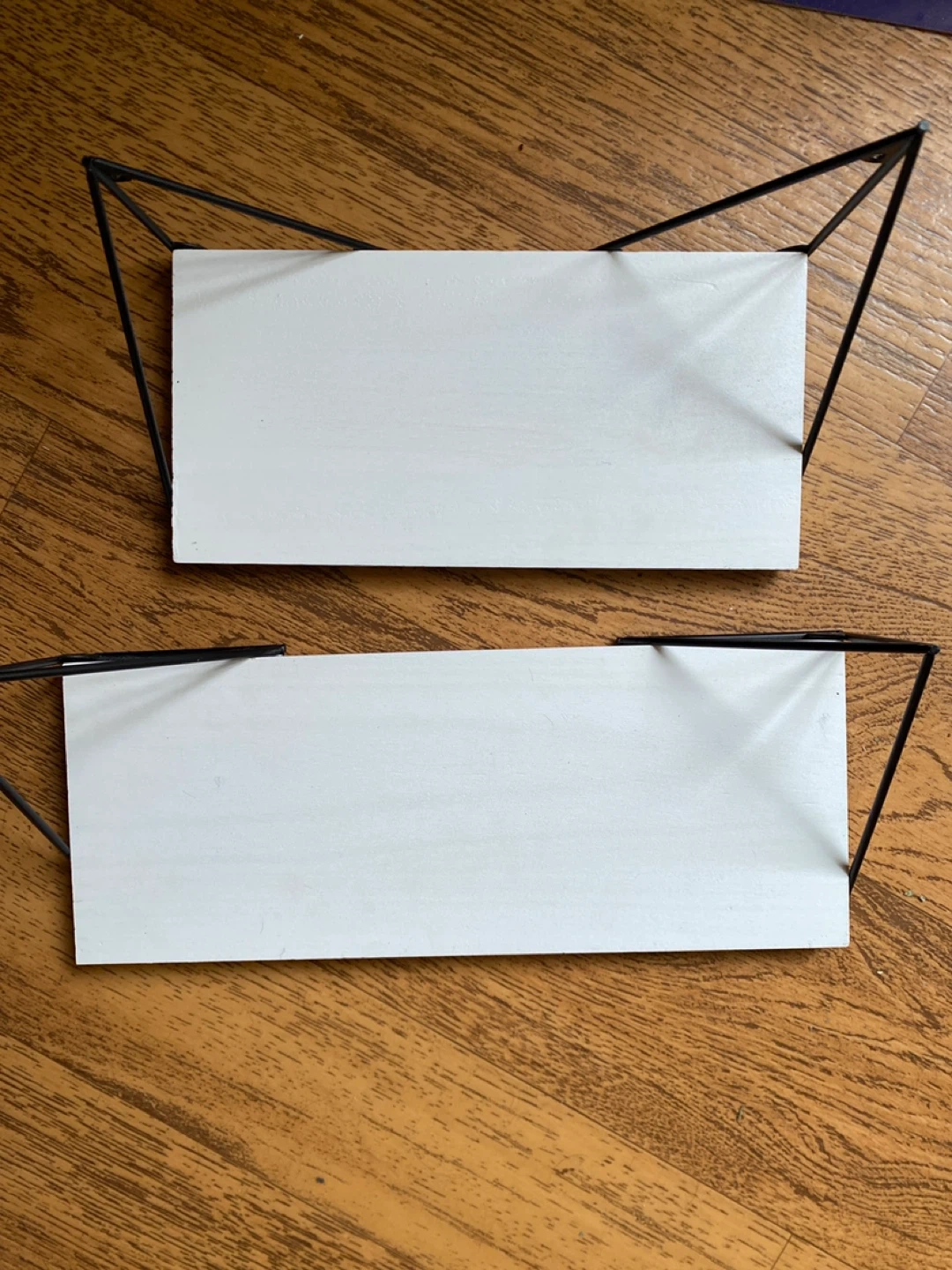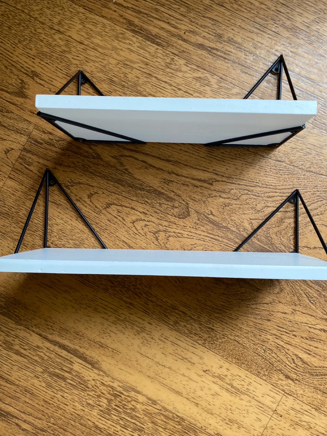 Selling a set of two white floating shelves with black metal brackets. They're in great shape and ready to add a touch of modern style to your space! Perfect for displaying your favourite items or adding extra storage 37.5cm x 15.1cm x 13.6cm 32.0cm x 14.9cm x 13.5