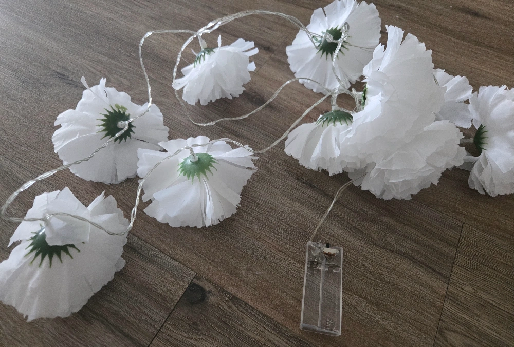Add a touch of whimsy to any space with these lovely white flower string lights! They're in great condition and ready to brighten up your home, garden, or next event. The lights are battery operated, making them easy to place anywhere without needing an outlet