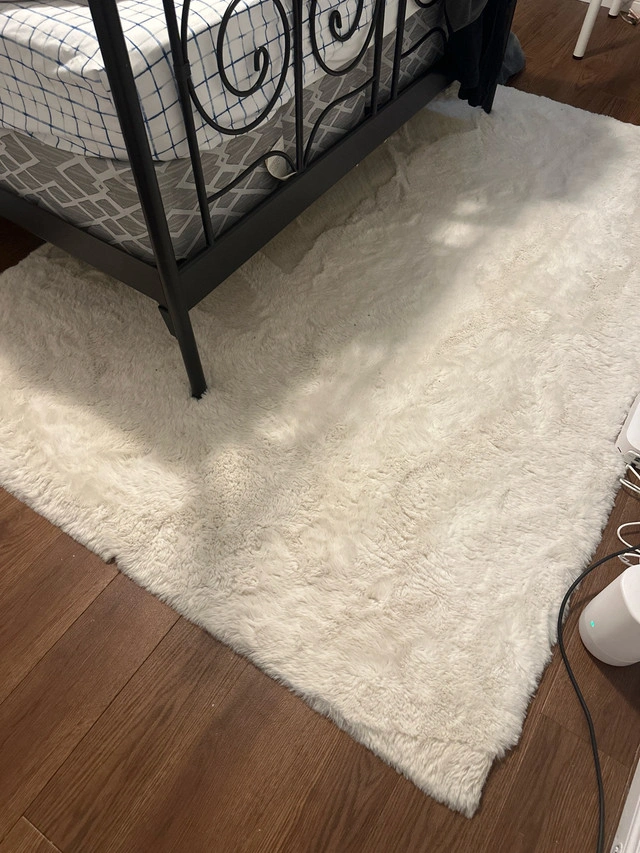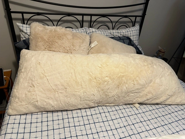 68I am selling a used set of white fluffy pillows, bolsters, and a small carpet, perfect for adding a touch of cozy comfort to any room. Pillows and bolsters were used only for decorative purposes. The set includes two square pillows, one long bolster pillow, and a matching carpet. Bug/smoke/pet free household. $50 for everything