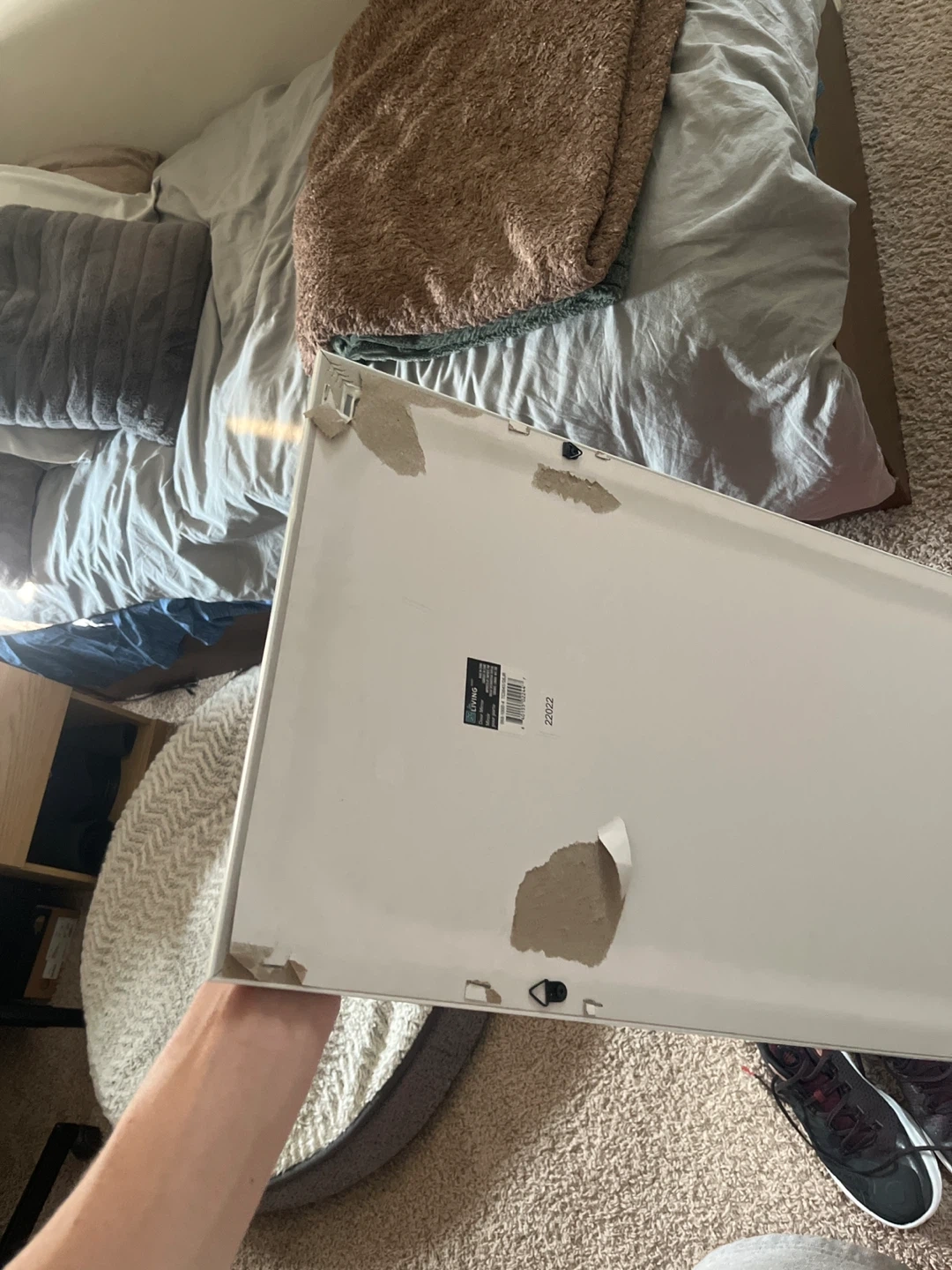Selling a full length mirror with a clean white frame. It's in great shape and ready to brighten up any room in your home The only thing about it is the back has a little bit of stuff taken off from it being hung up but other then that it’s great