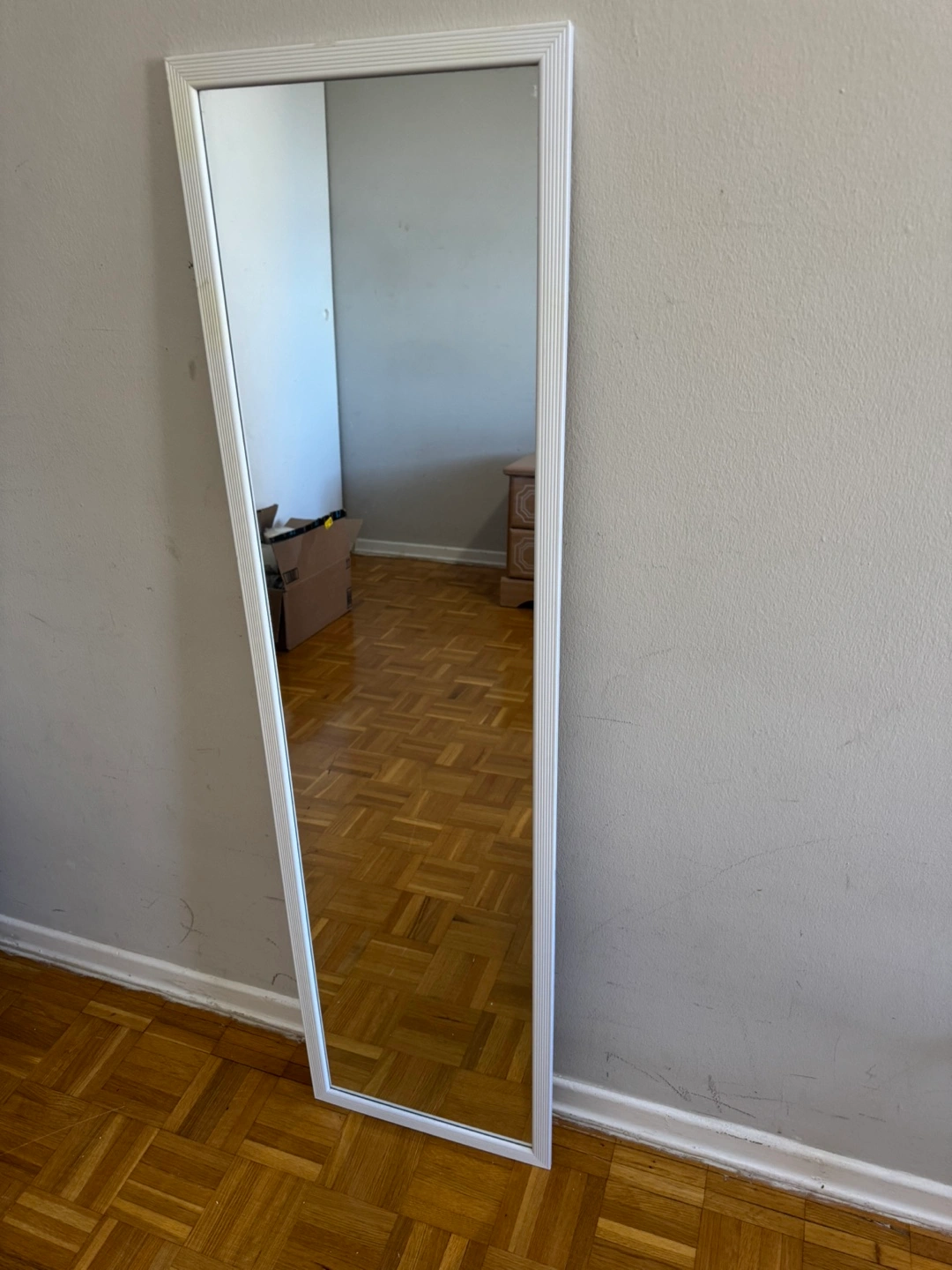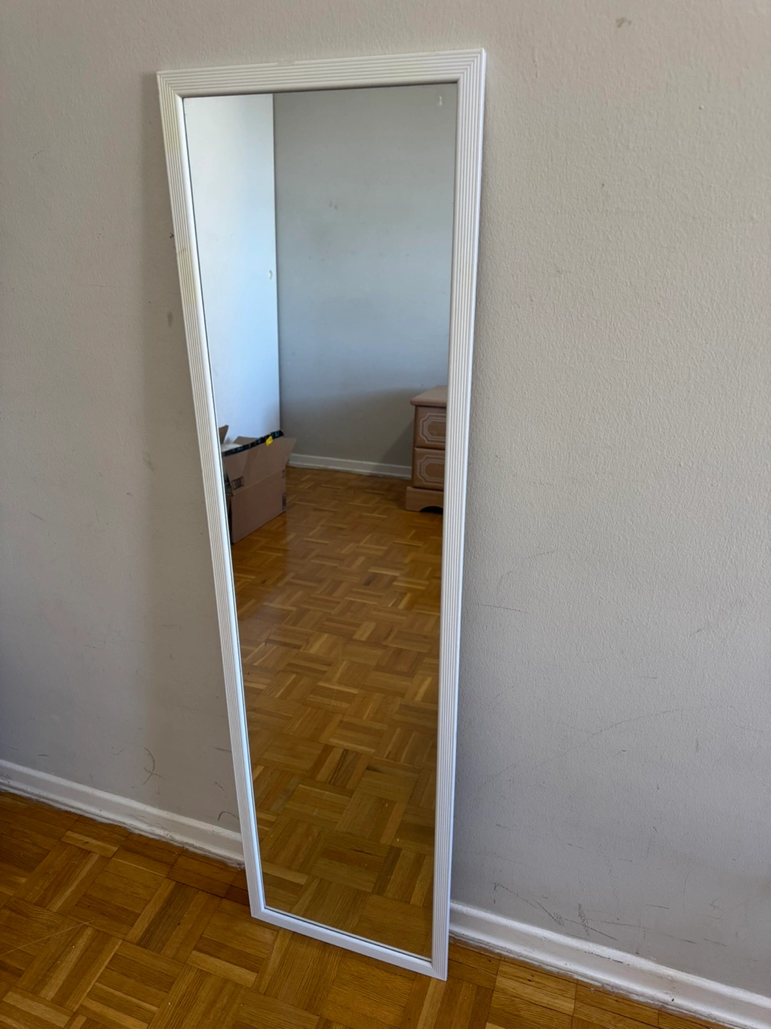 10Selling a full-length mirror with a simple white frame. It's in great shape and ready to brighten up any room. Perfect for bedrooms, closets, or entryways to check your outfit before heading out