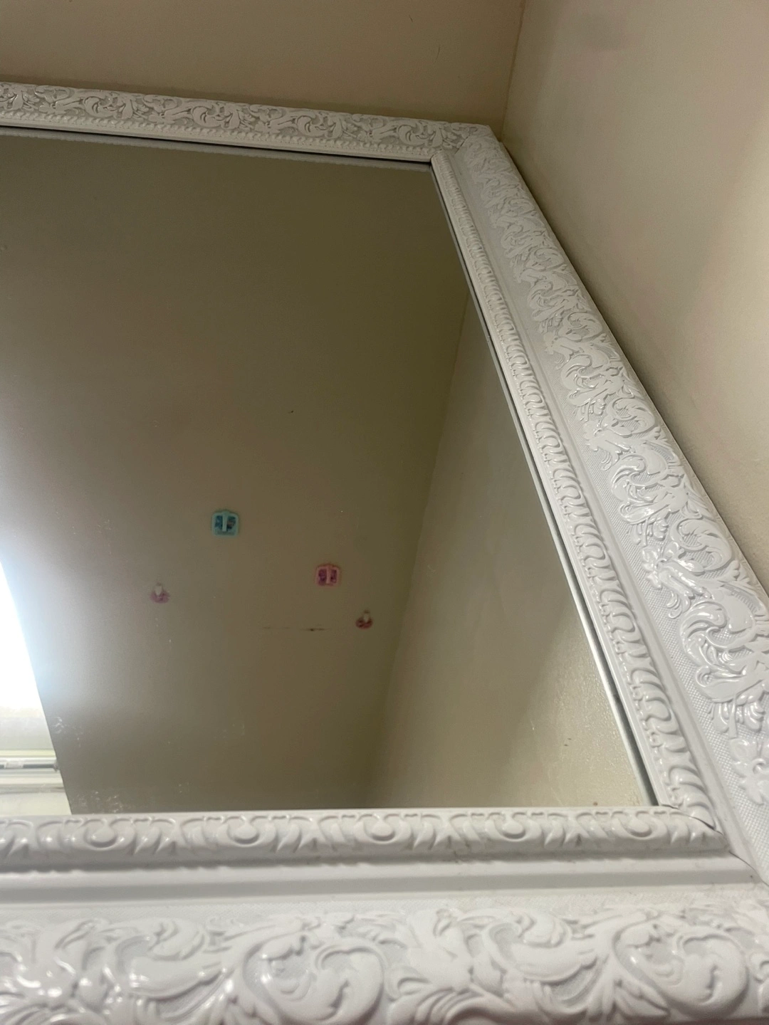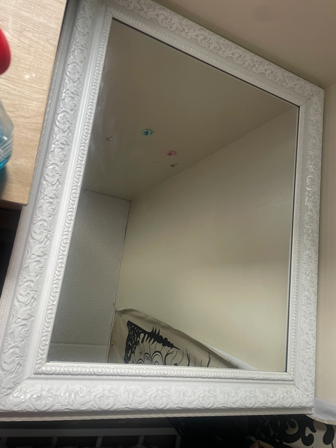 Selling a lovely white framed mirror. The frame has a beautiful ornate design, adding a touch of elegance to your space. It's in great condition and ready to find a new home