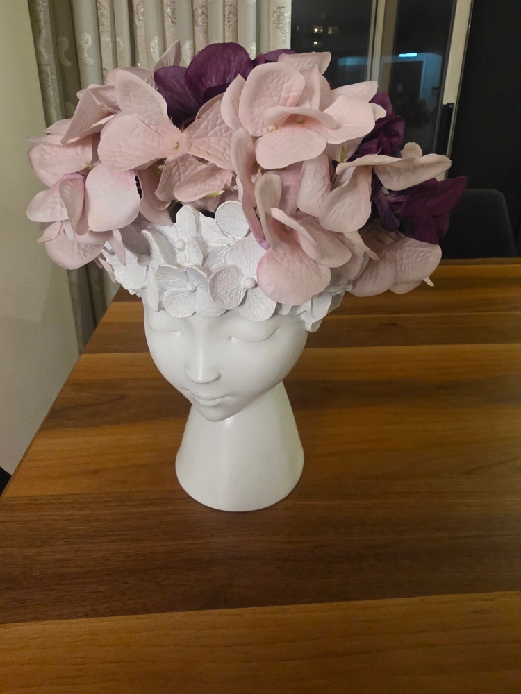 I'm selling a lovely white head vase topped with beautiful hydrangeas. It's in great condition and would make a charming addition to any room. The vase has a unique design and the flowers add a touch of elegance