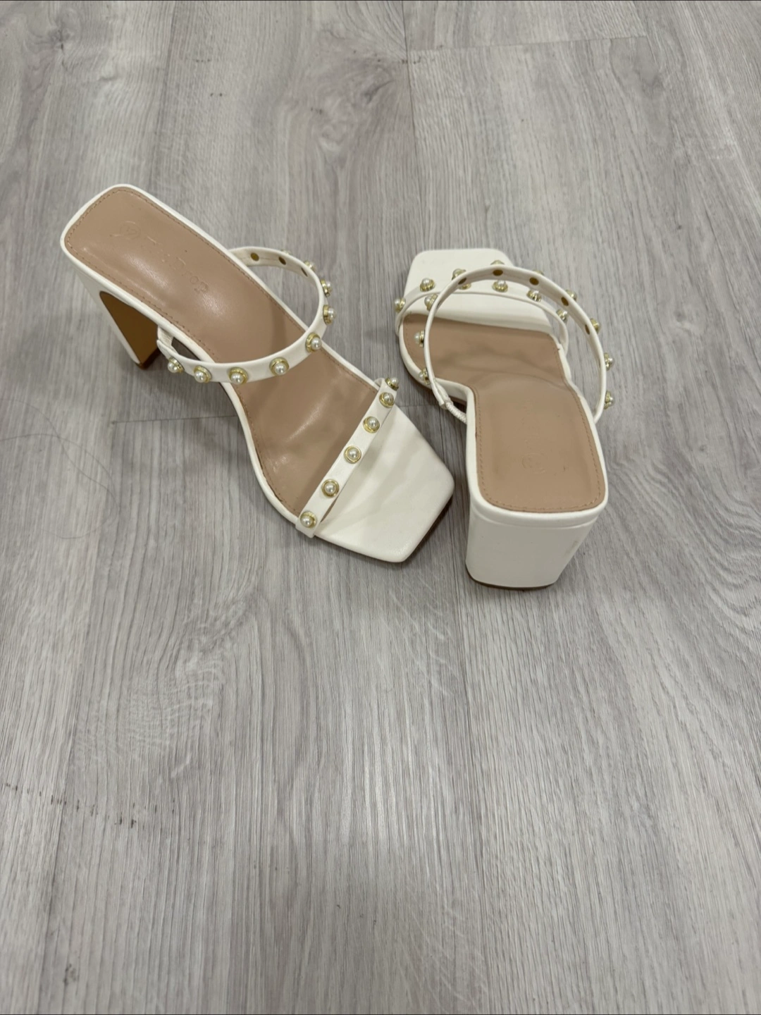 30These cute white heeled sandals are perfect for dressing up any outfit! They're a size 37 and feature a square toe and pearl detailing Used once