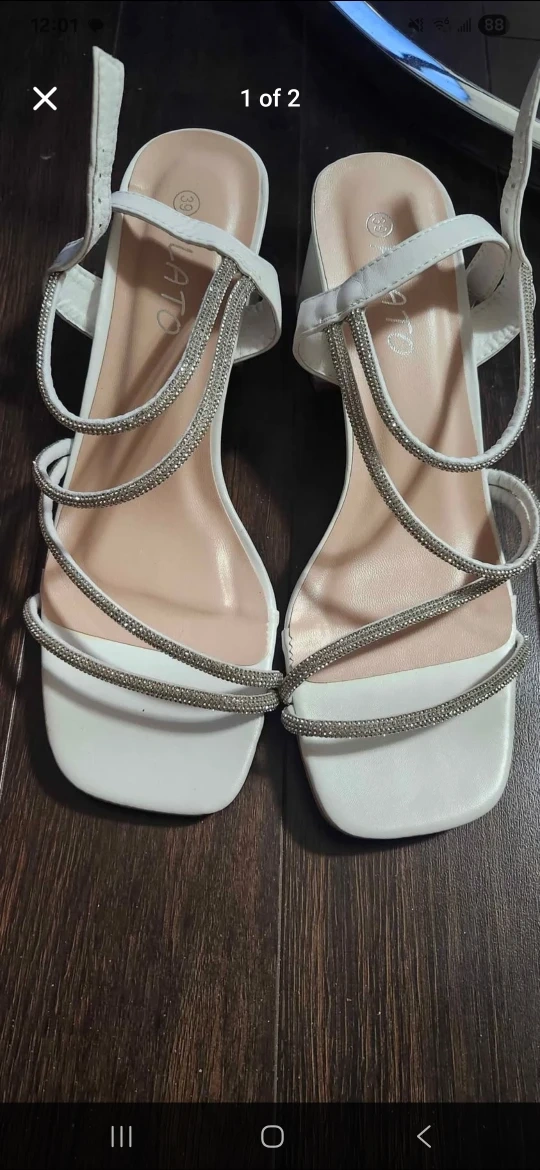 10Selling a pair of wedding heels in white, size 9. These are in great condition and feature elegant, sparkly straps. Perfect for a night out or a special occasion!