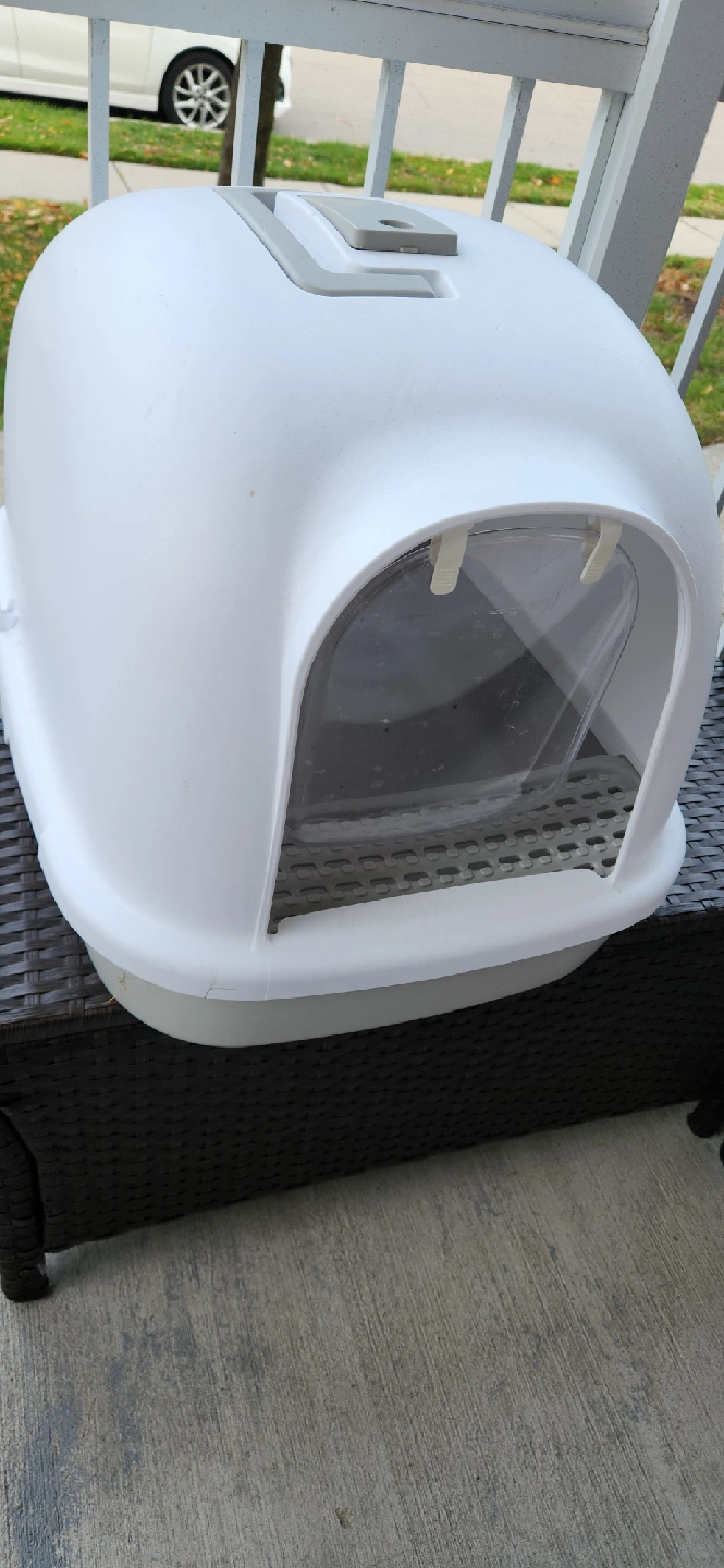 Selling a hooded cat litter box in great condition! It's white and provides privacy for your furry friend while helping to contain litter scatter. Perfect for keeping your space tidy and your cat happy