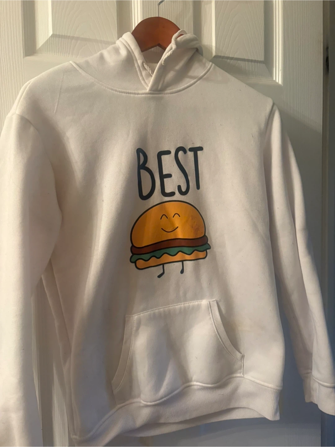A white hoodie featuring a cute burger design! It's super comfy and has a handy pocket in the front. Perfect for casual wear or lounging around at home