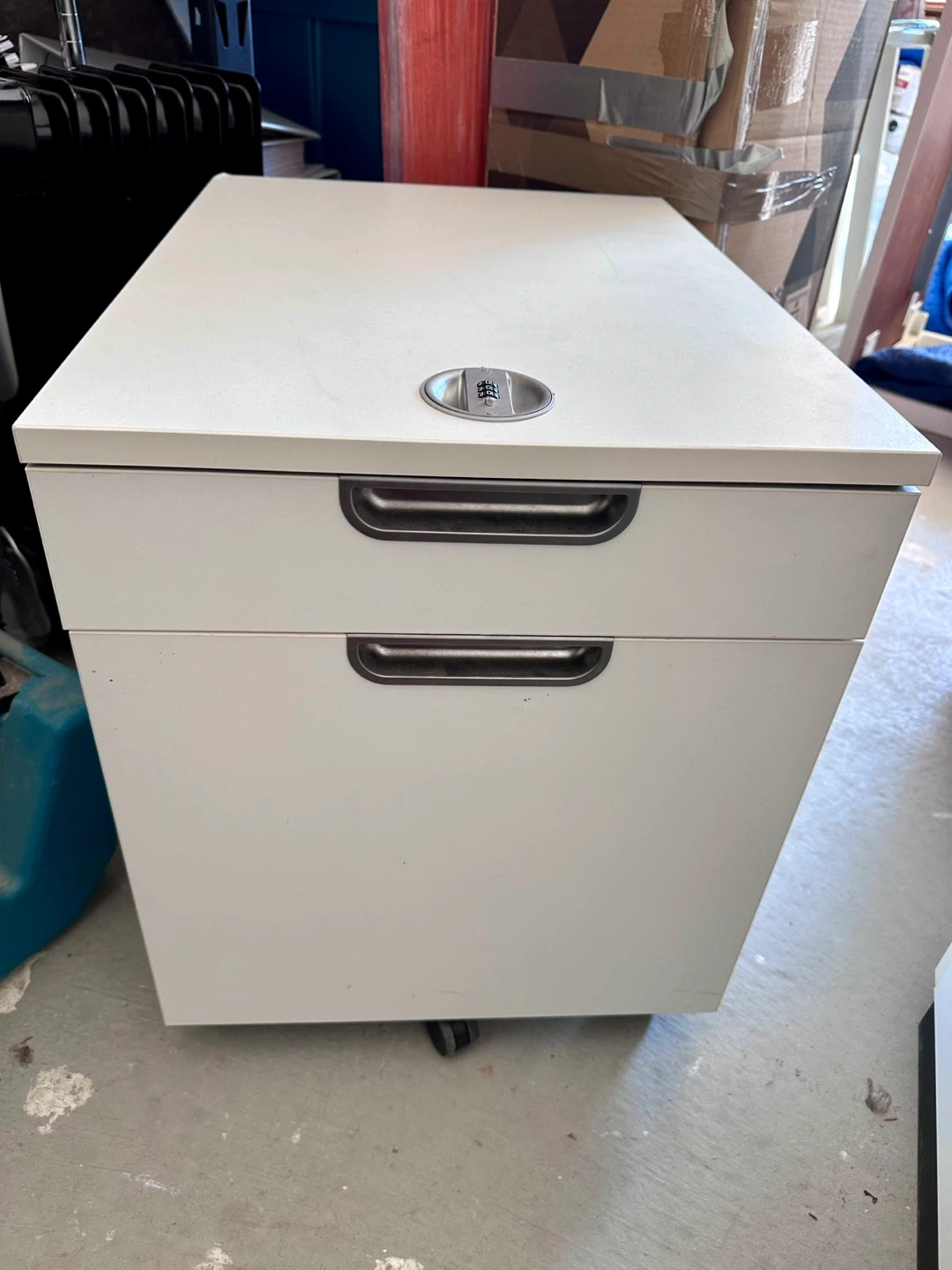 23Selling a white two-drawer filing cabinet. It has a combination lock on the top drawer for added security. It's on wheels, so it's easy to move around your home office or workspace. There are some signs of use.