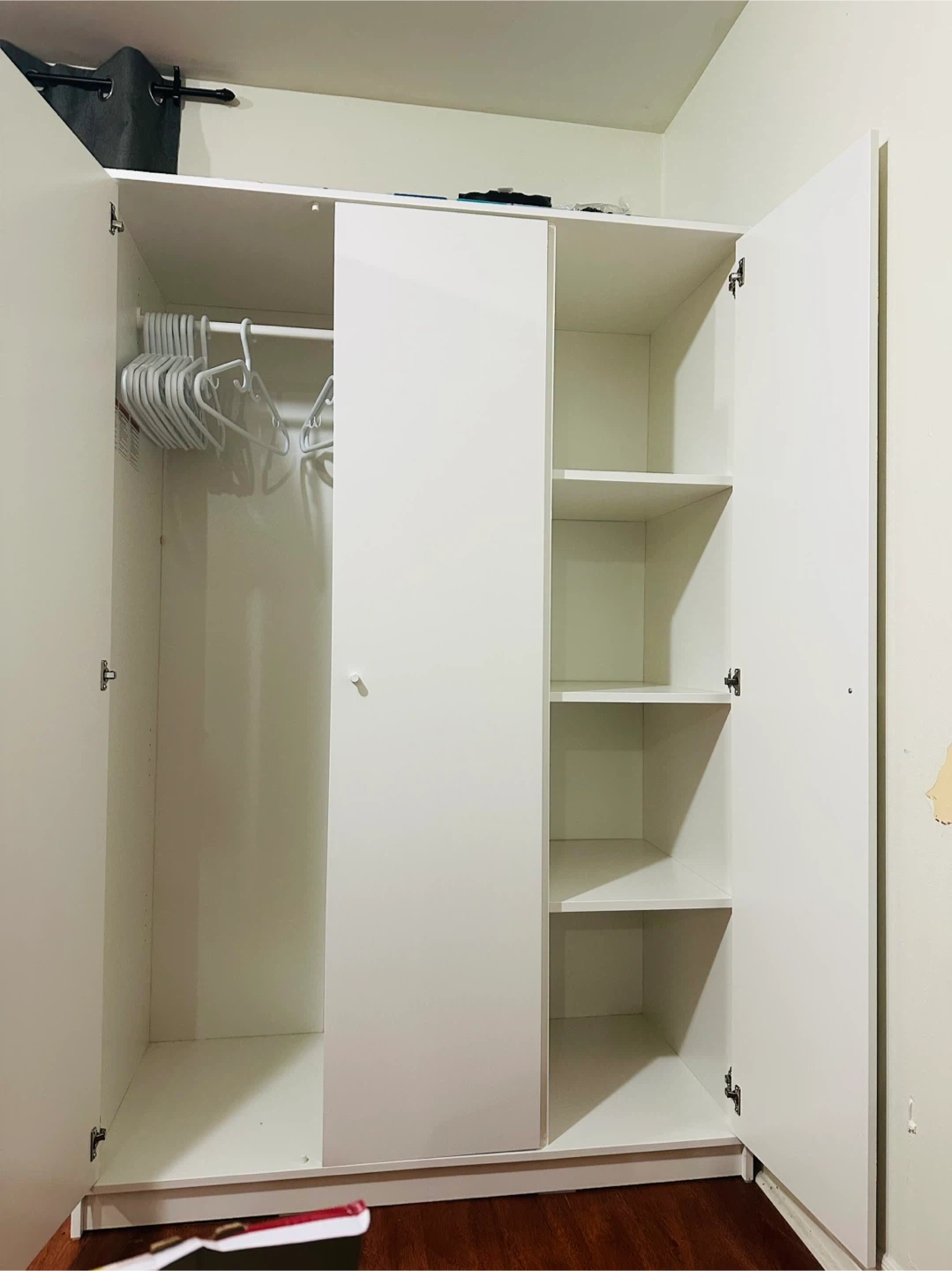 10Selling an IKEA wardrobe in good condition. It's white and has three doors. Inside, there's a hanging rod on one side and shelves on the other, so you can store clothes and other items neatly. Perfect for adding extra storage space to your room! It’s barely used. No scratches or marks on it.