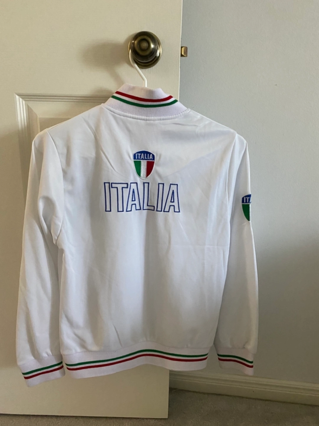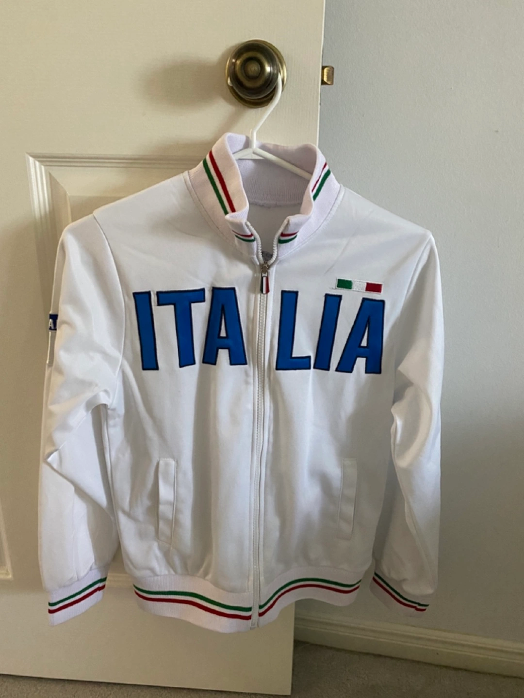 37White track jacket. Features an Italia logo on the back and sleeves. Green, white and red coloured trims. Zip-up closure.
