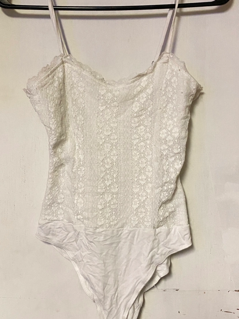 15White lace bodysuit with a scoop neck and spaghetti straps. The bodysuit has a small amount of stretch.