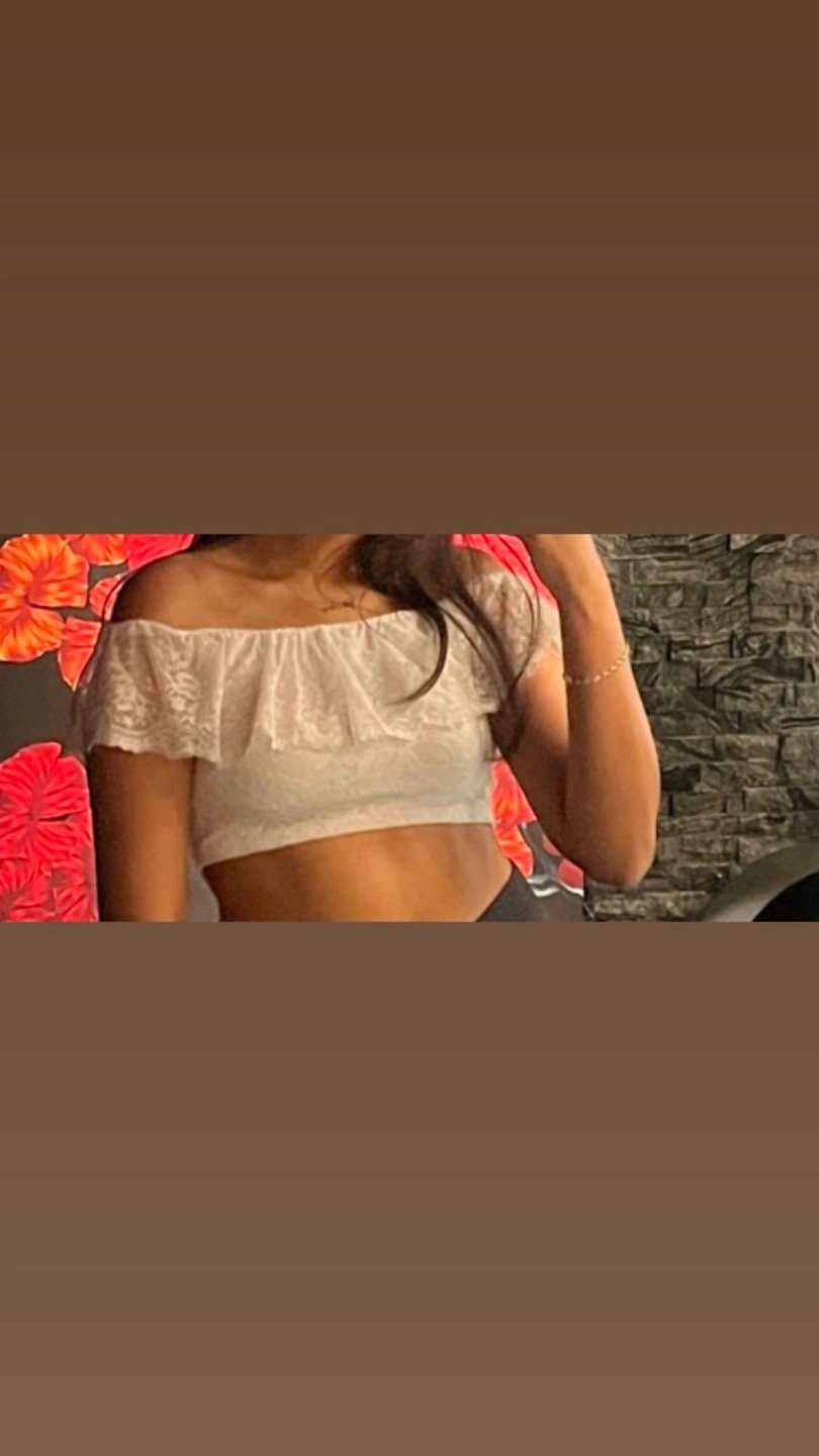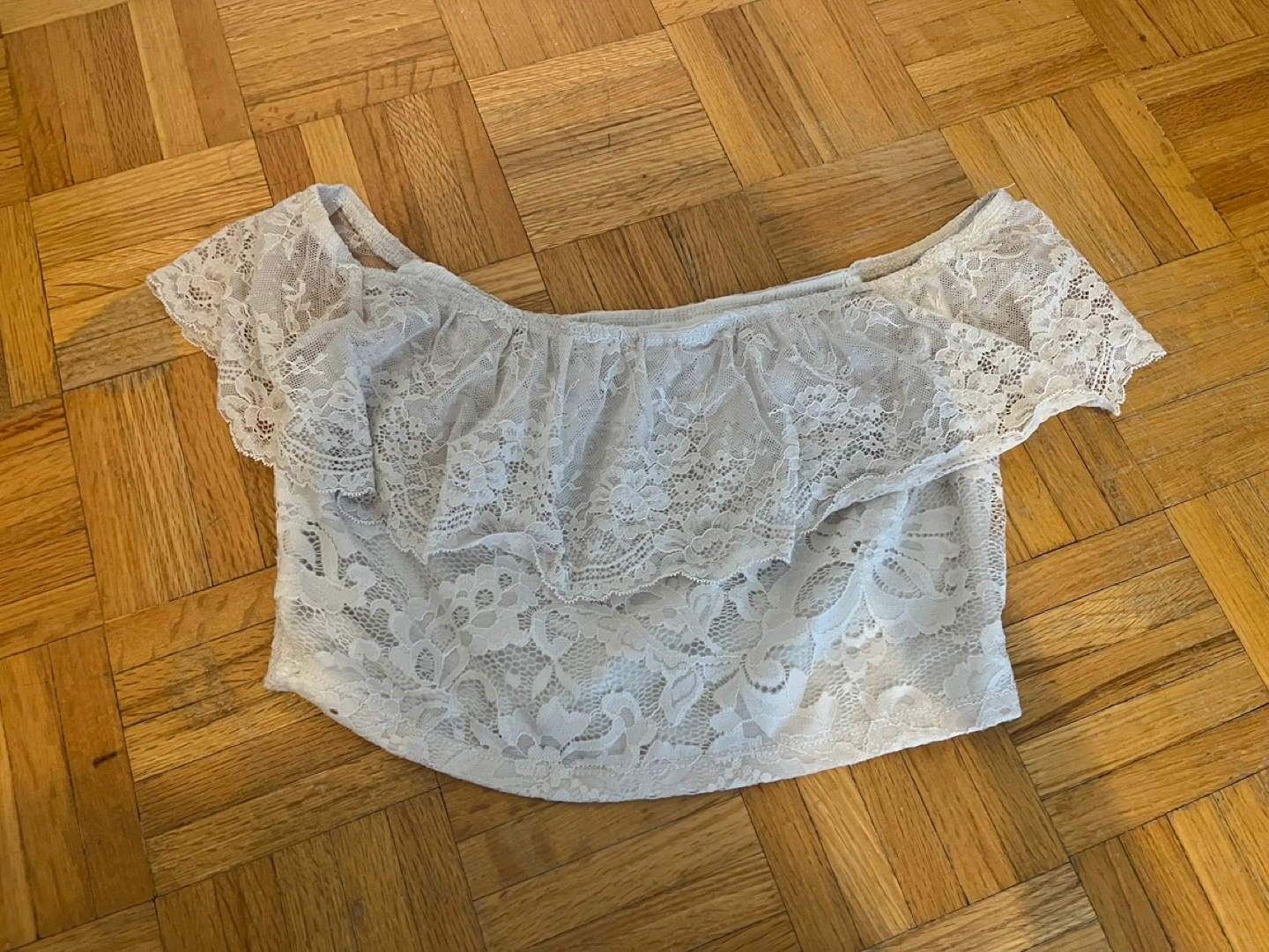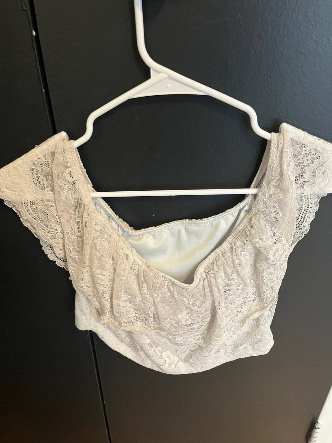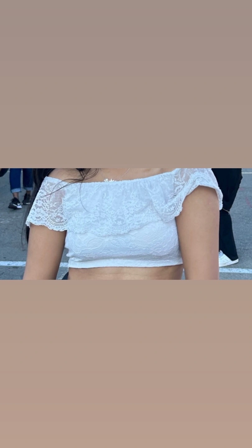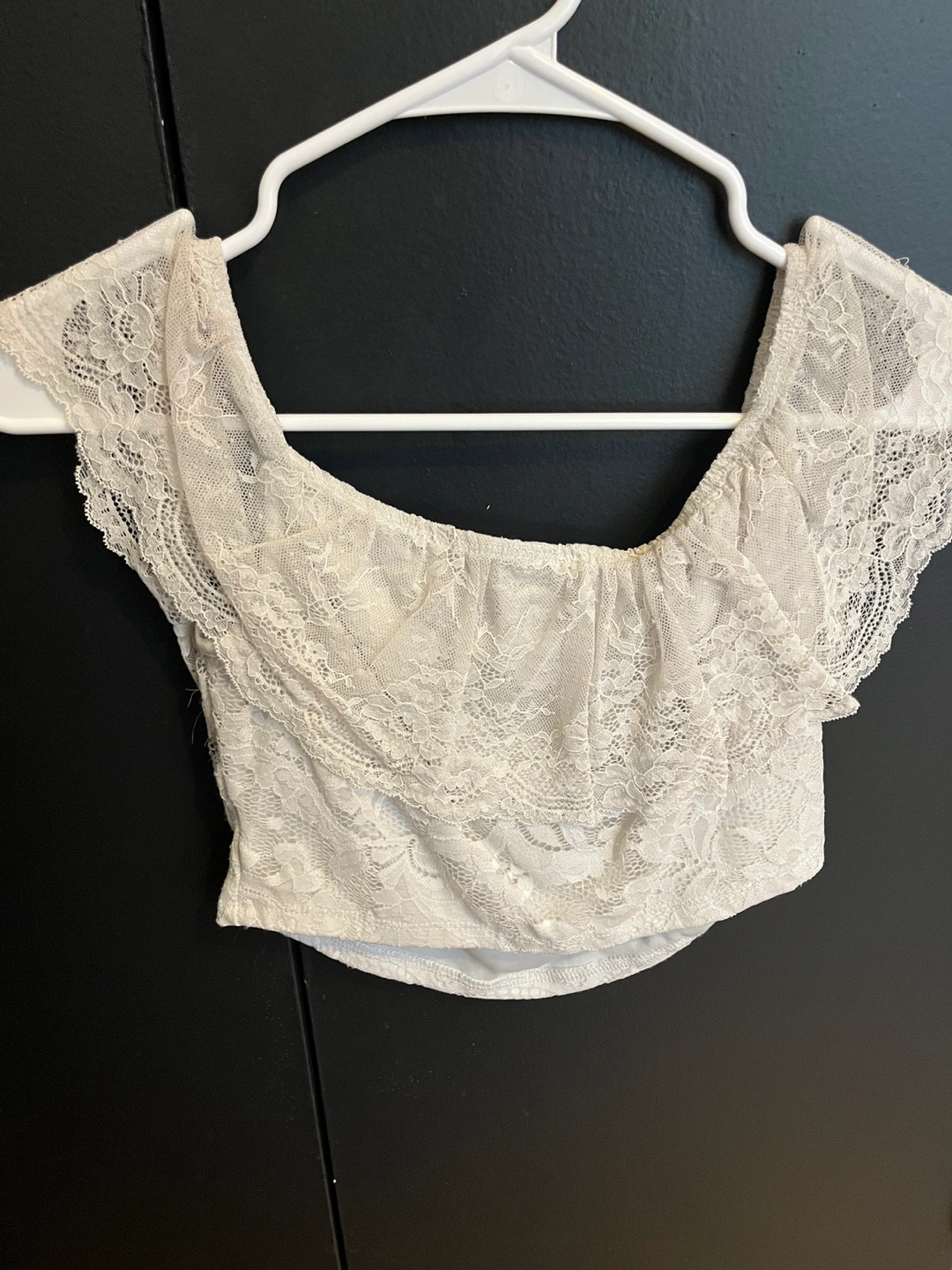 White lace off the shoulder crop top. It has a ruffle detail at the neckline, very pretty. Fits size S and M. Very pretty, I don’t wear it anymore