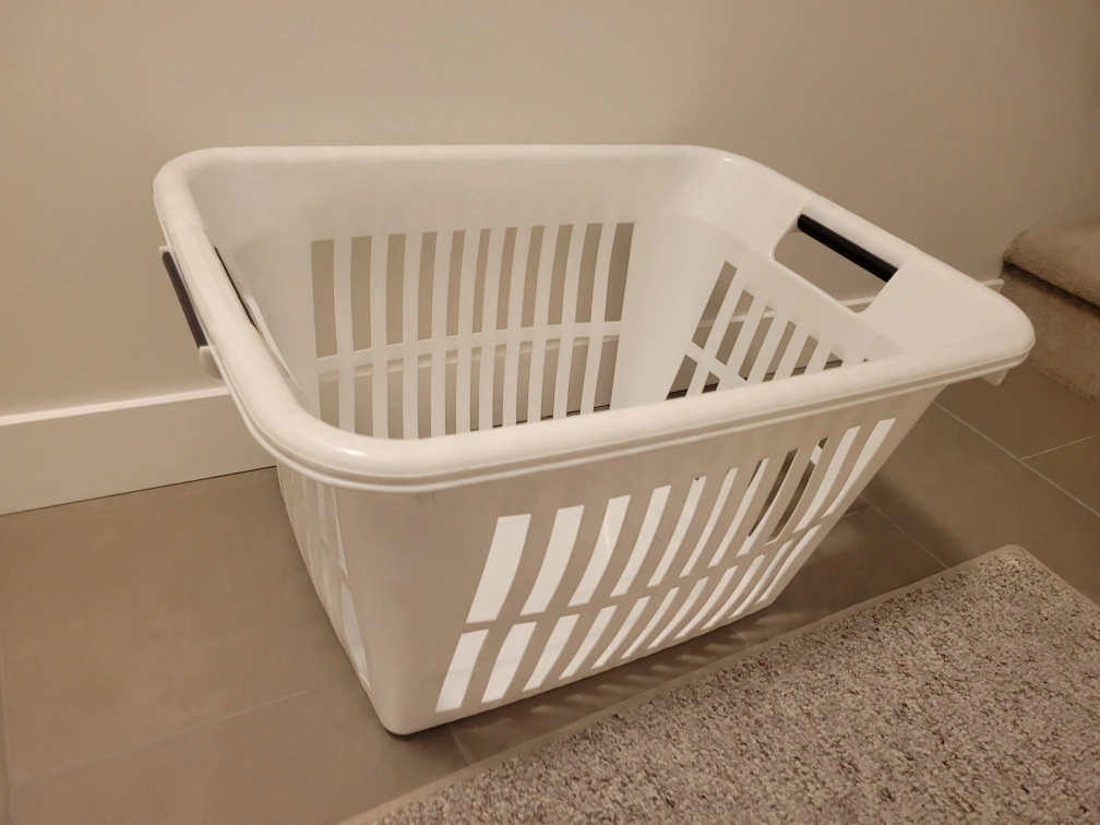 White laundry basket with two black handles. Great for holding laundry or other items.