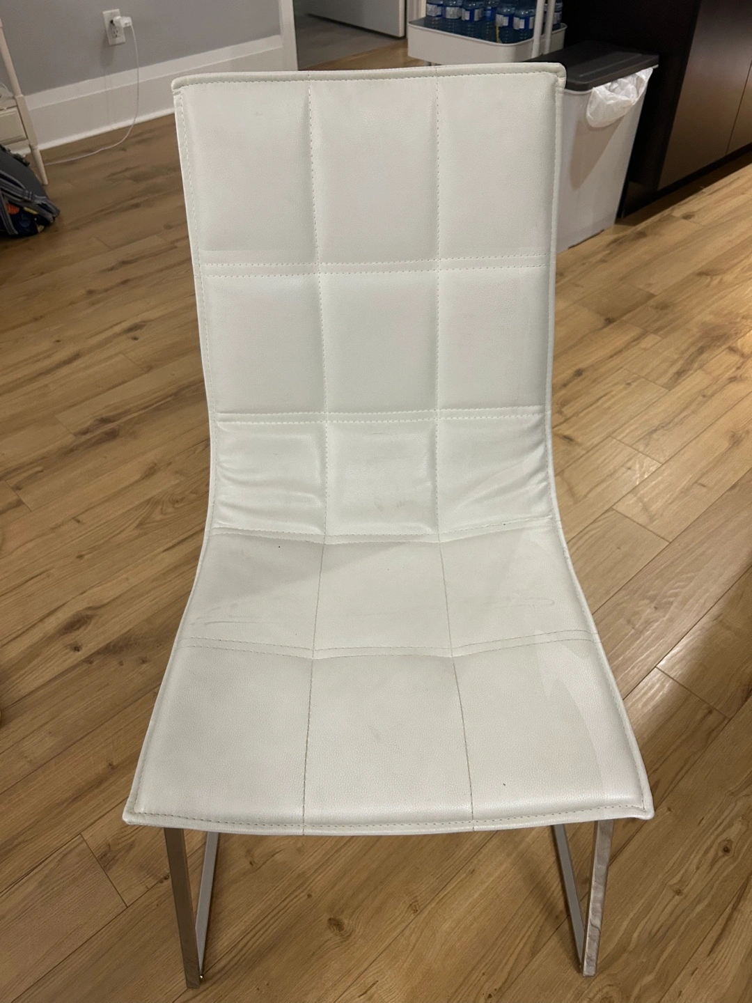 Selling a stylish white leather dining chair with a chrome frame. It's in great shape and would look fantastic in any dining room or kitchen. The chair is comfortable and sturdy, perfect for everyday use. It's a modern design that will add a touch of elegance to your space