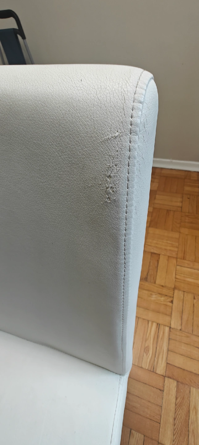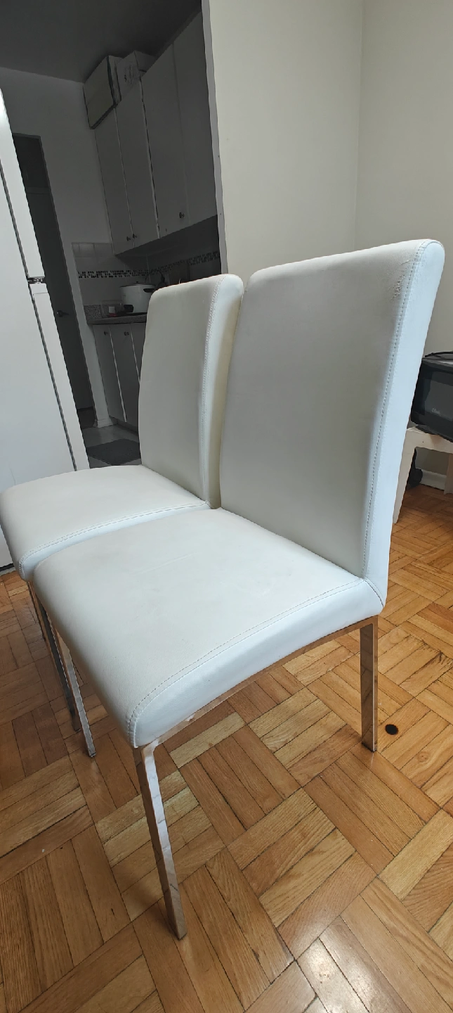 Selling a set of two dining chairs with white leather upholstery and metal legs. There is some cracking on the back of one chair, as shown in the photos. Also check my other Listings too😊