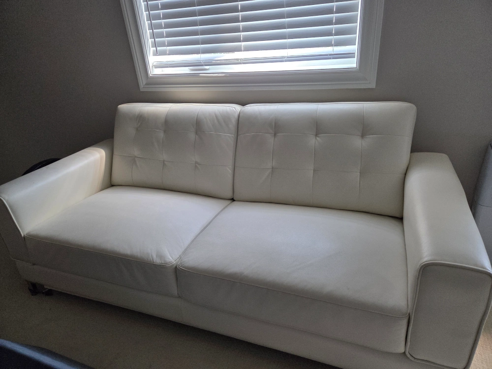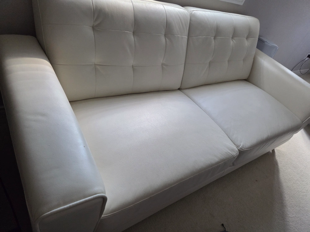 Selling a comfy white leather sofa! It's in great shape and would look great in any living room. The material is soft and the cushions are supportive, perfect for relaxing after a long day. Cushions are not removable.