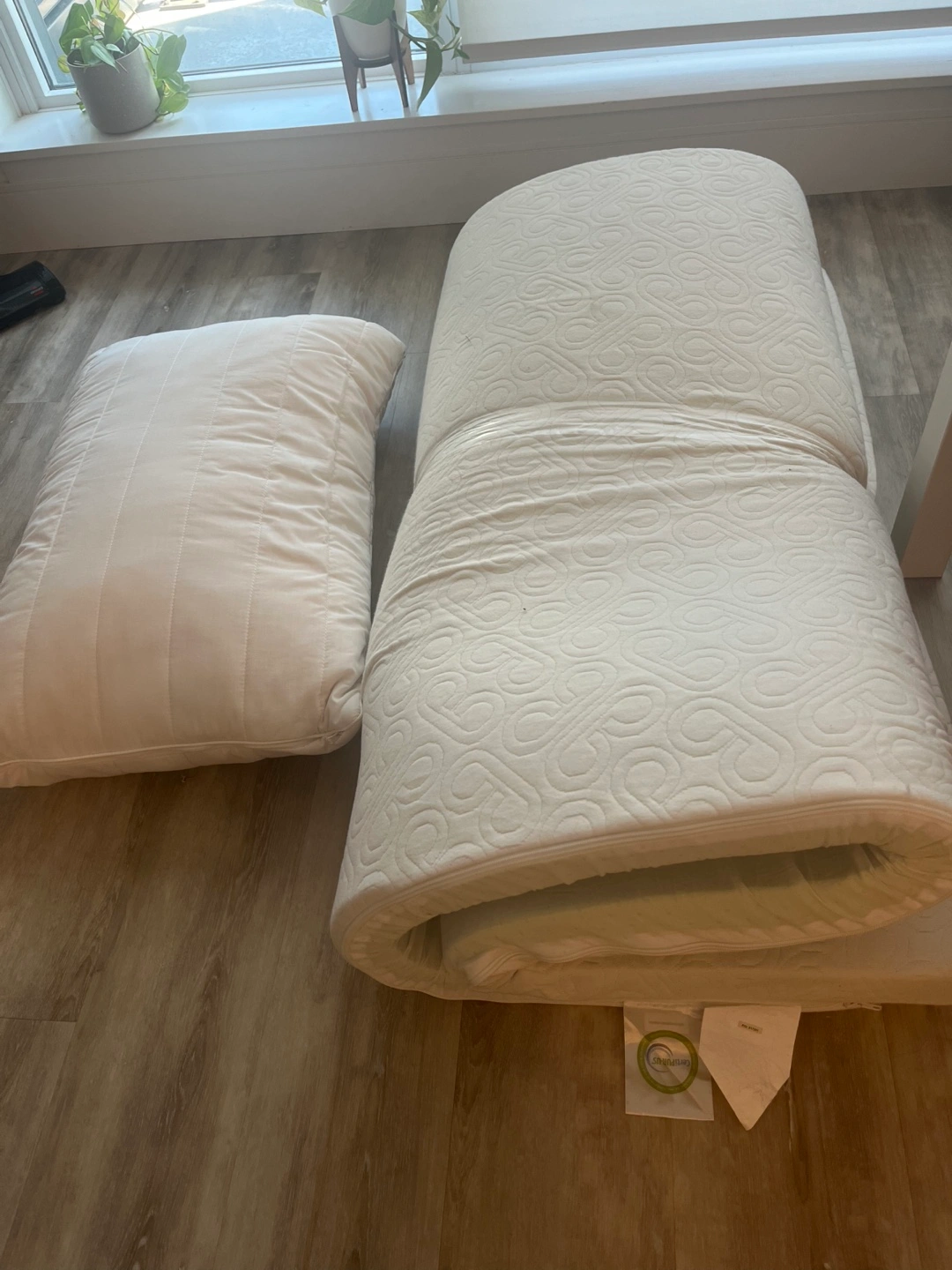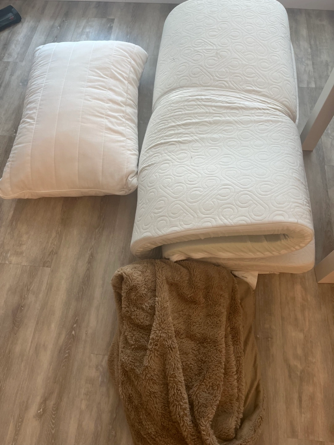 39Selling a mattress topper and pillow set! The set is white and in good condition. Small blanket too. All in one bundle