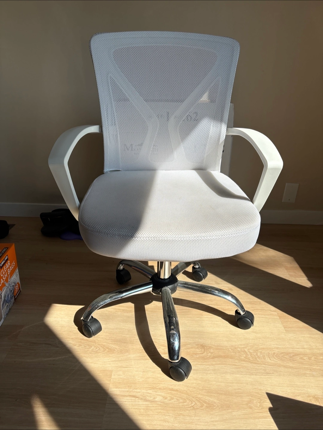 90Selling a comfortable white mesh office chair. It has a breathable mesh back and a padded seat for extra comfort. The chair also features adjustable height and swivel function. Perfect for your home office.