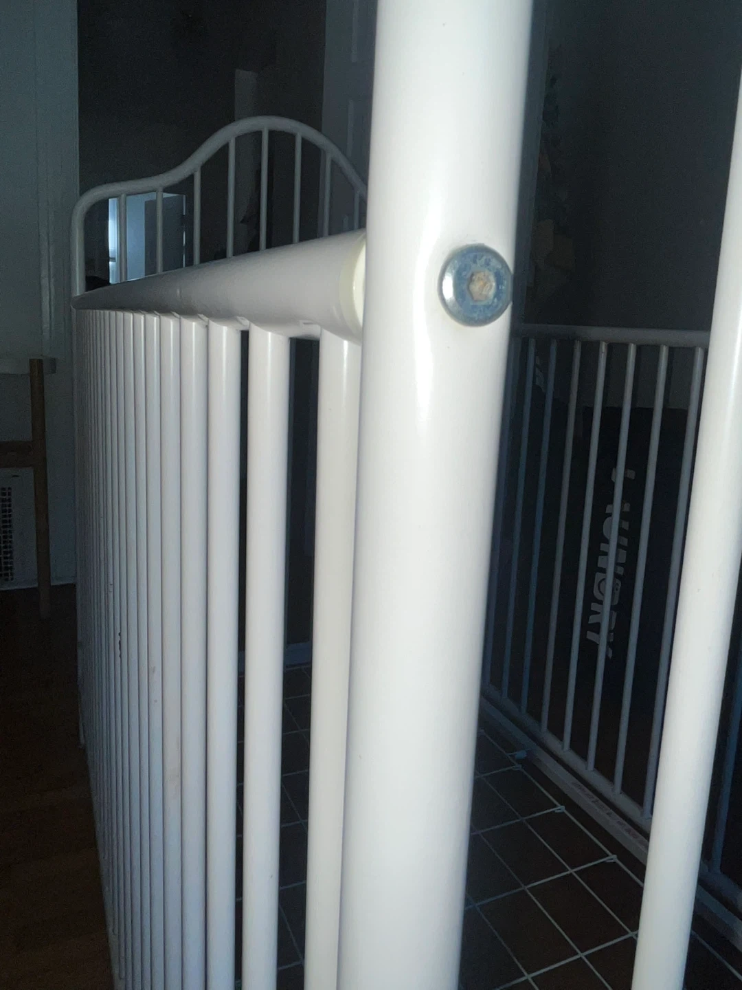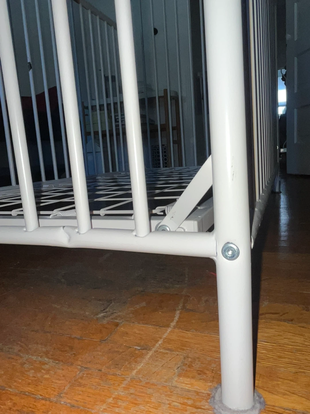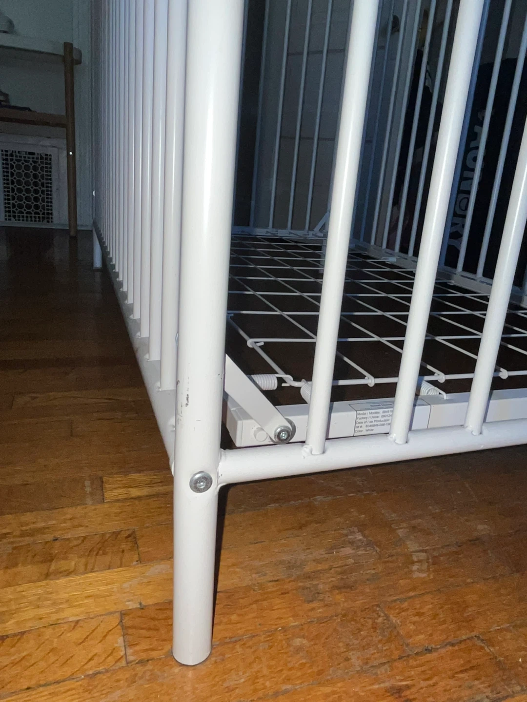 65Sturdy white metal crib in good condition. The crib offers two adjustable mattress height positions, making it suitable for both infants and toddlers. One side can be removed to convert it into a simple daybed as your child grows. All original safety stickers are still intact, and the crib meets modern safety standards. There are a few minor cosmetic scratches on the frame from regular use, but nothing that affects its function, stability, or safety. Please note: **Mattress not included.** Easy to assemble and disassemble. Clean, neutral design fits well with any nursery decor.