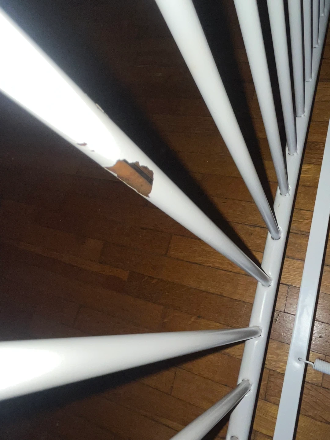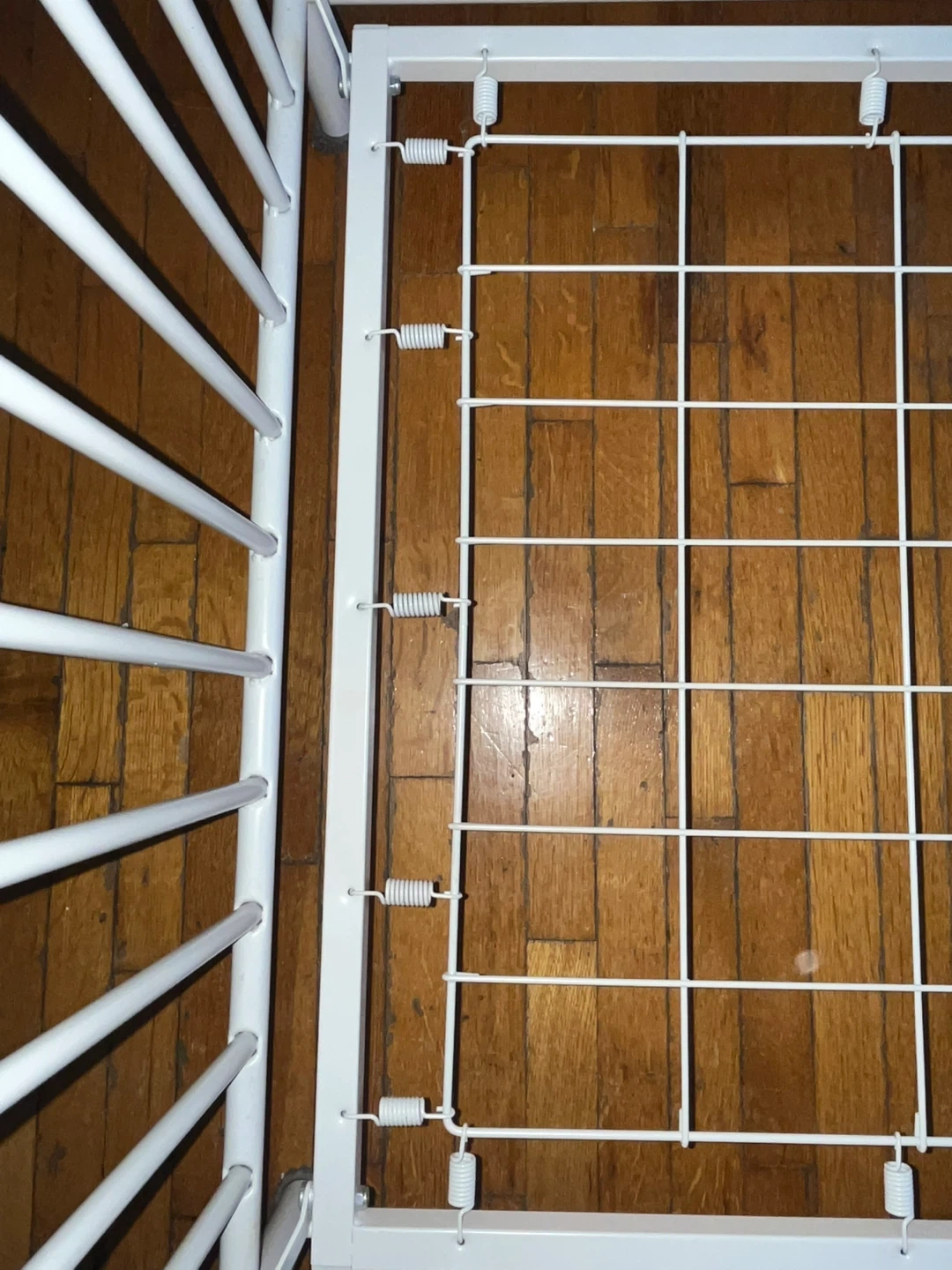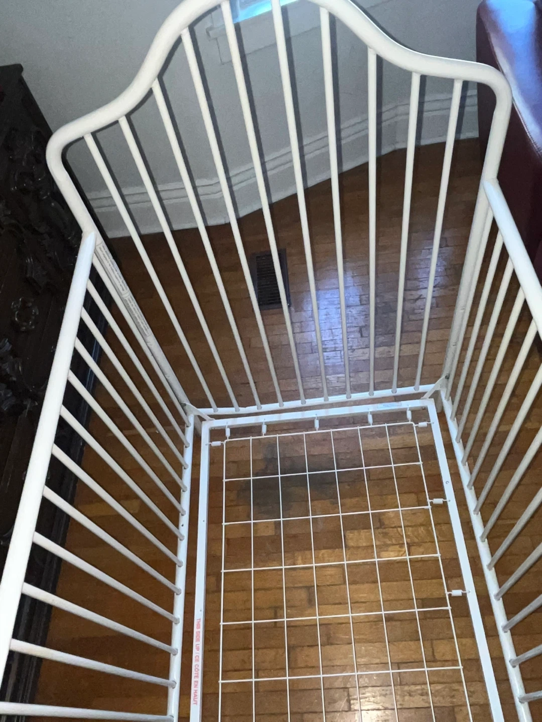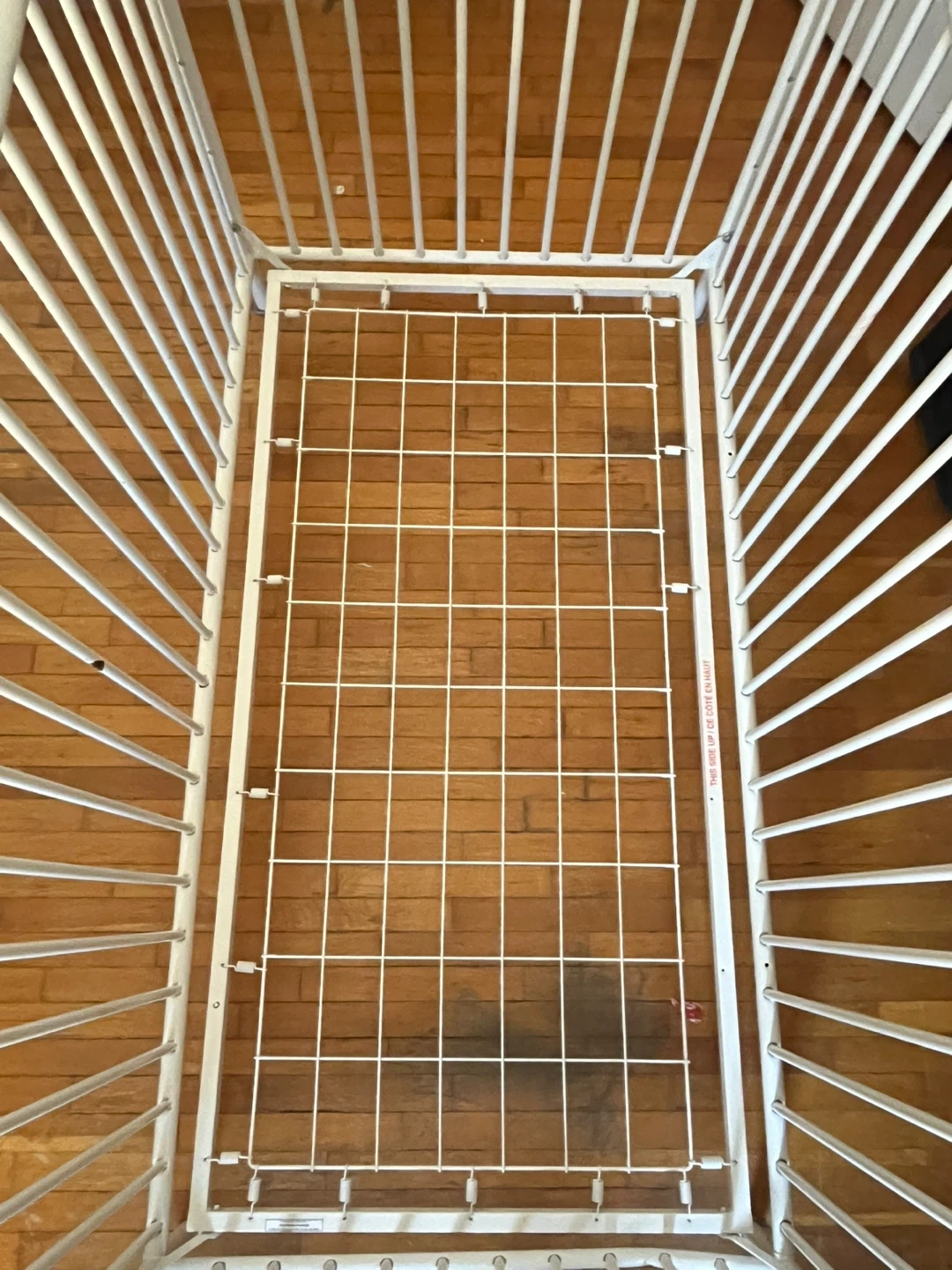 65Sturdy white metal crib in good condition. The crib offers two adjustable mattress height positions, making it suitable for both infants and toddlers. One side can be removed to convert it into a simple daybed as your child grows. All original safety stickers are still intact, and the crib meets modern safety standards. There are a few minor cosmetic scratches on the frame from regular use, but nothing that affects its function, stability, or safety. Please note: **Mattress not included.** Easy to assemble and disassemble. Clean, neutral design fits well with any nursery decor.
