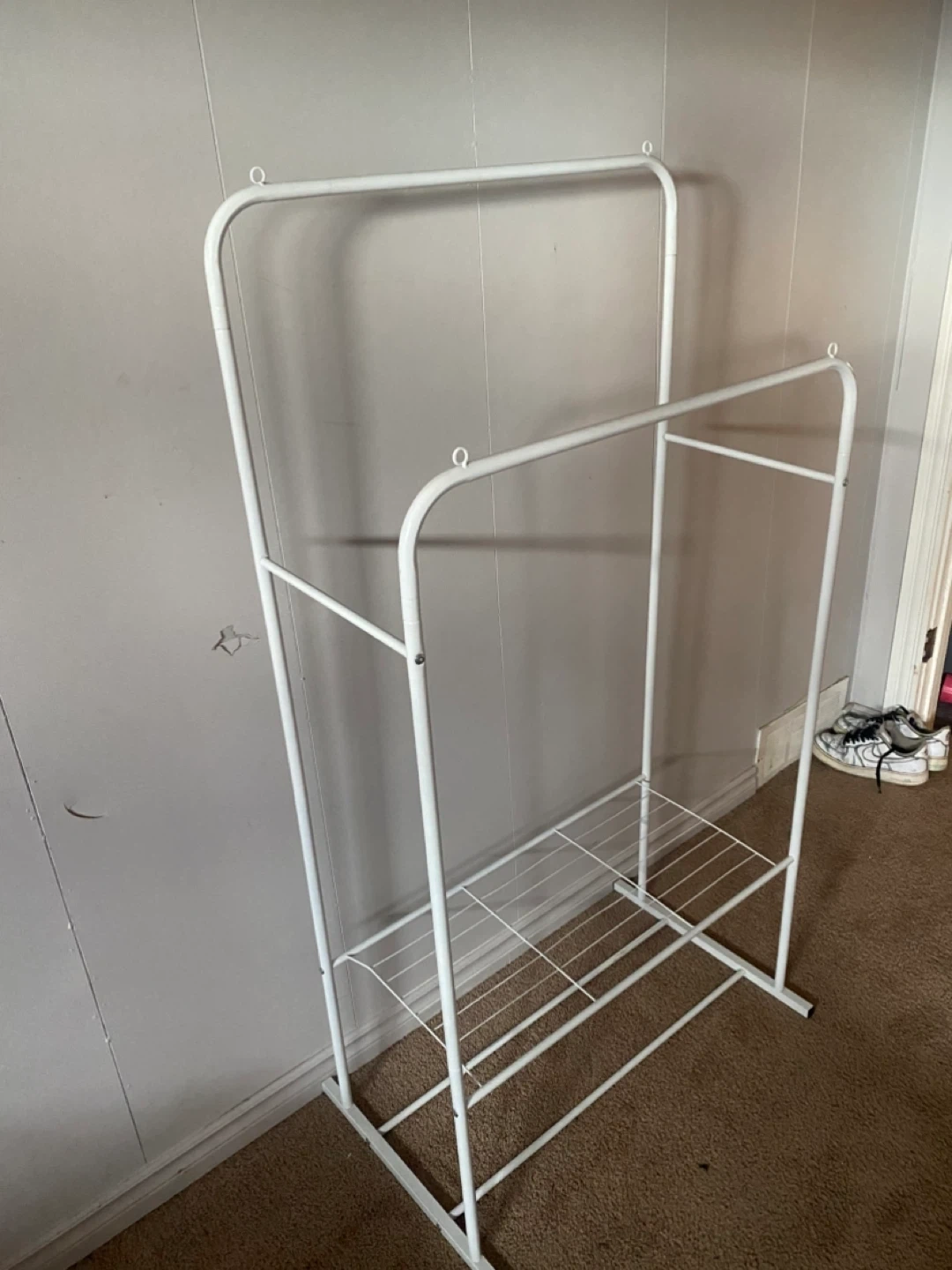 10Here's a handy white metal garment rack for extra storage! It features two hanging bars and a wire shelf at the bottom, perfect for shoes or folded items. It's in great condition and ready for a new home!