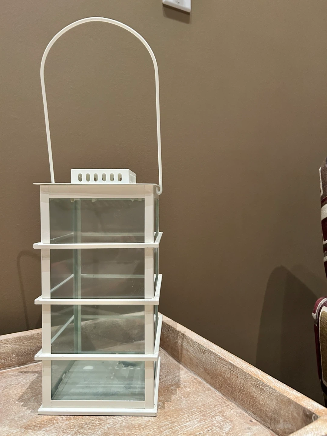 38Selling a white metal and glass lantern! It's perfect for adding a touch of warmth and light to your space