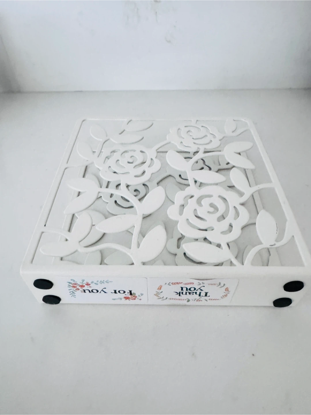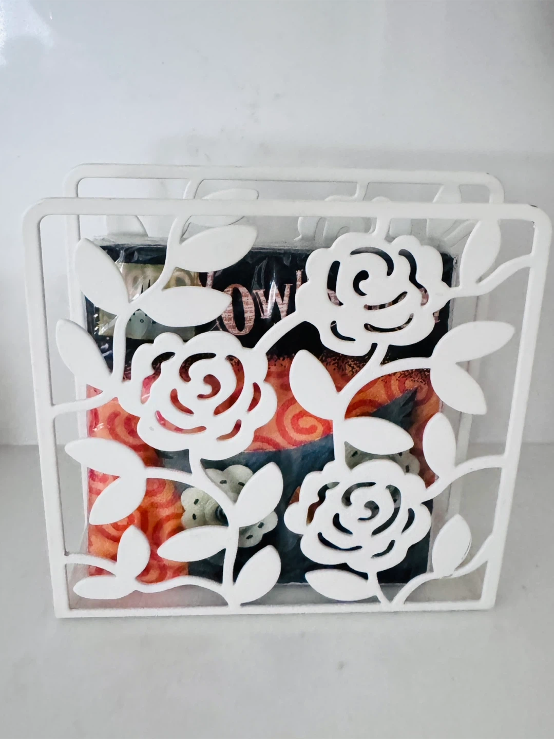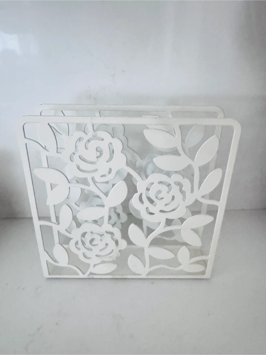 Here's a lovely white metal napkin holder, perfect for adding a touch of elegance to your table setting. It features a beautiful floral design with roses and leaves. It's in great condition and ready to hold your napkins in style!