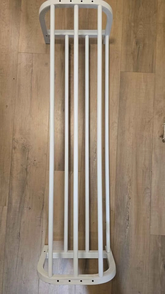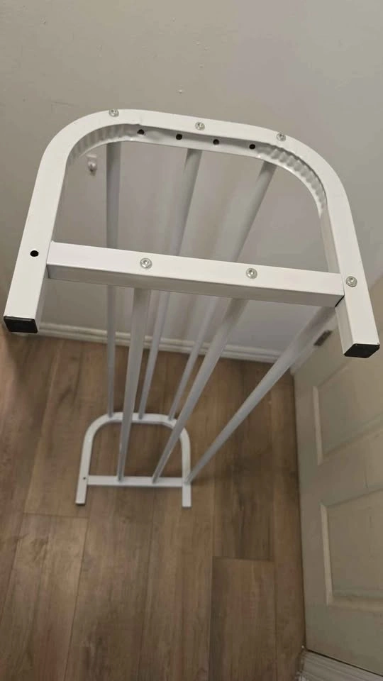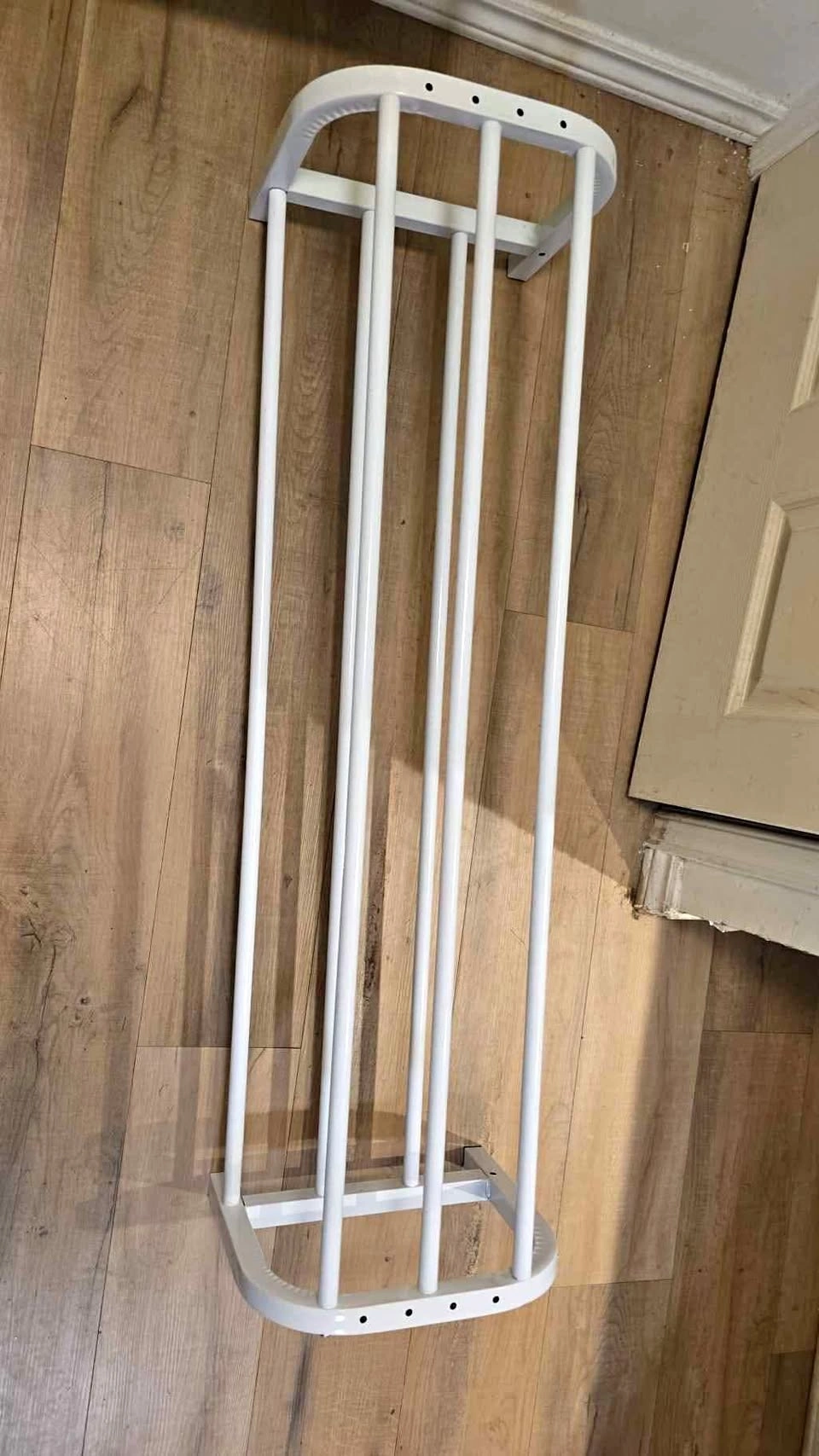 65Sturdy and clean white metal shoe rack in great condition. Perfect for organizing shoes, bags, or other items. Dimensions: 110cm (L) × 30cm (W) × 30cm (H). Pickup: 1300 Mississauga Valley Blvd