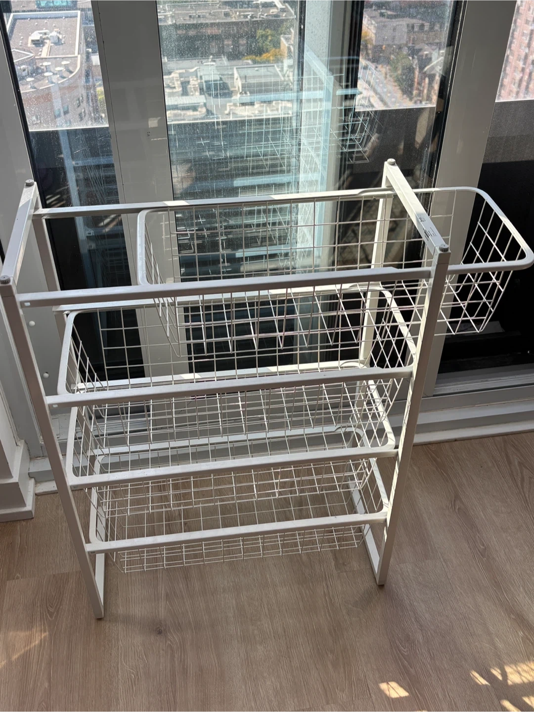 Selling a metal wire basket shelf! It's in great condition and perfect for extra storage in any room. Its white colour will match any decor