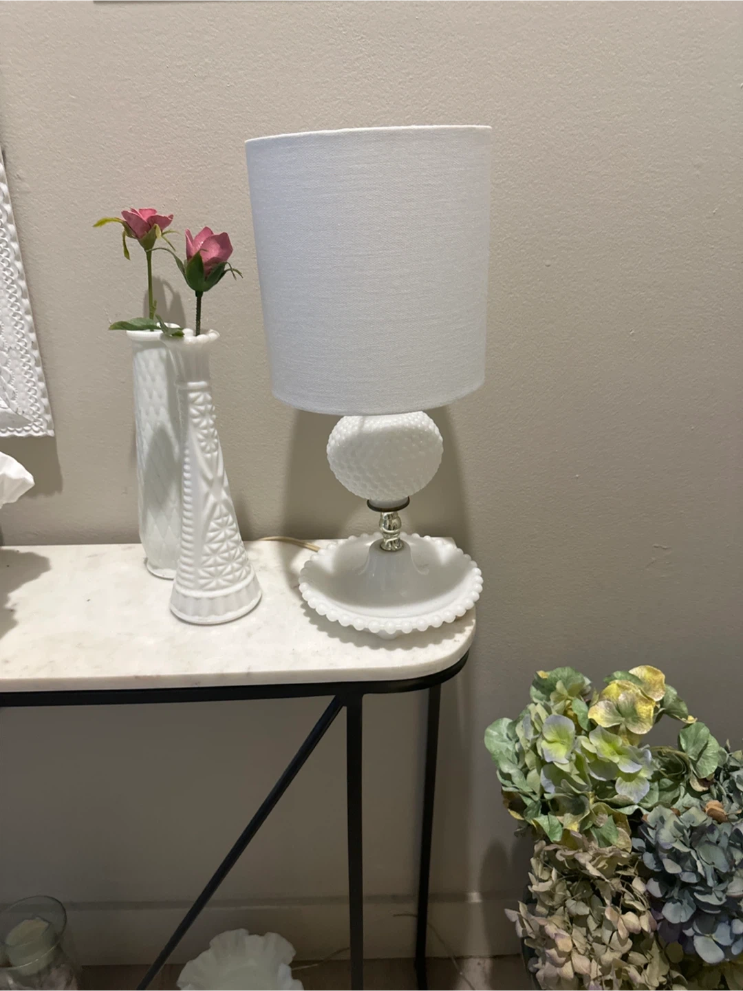 Selling a lovely white milk glass lamp! It comes with a white shade and would be a beautiful addition to any room. It's in great condition and ready to brighten up your space