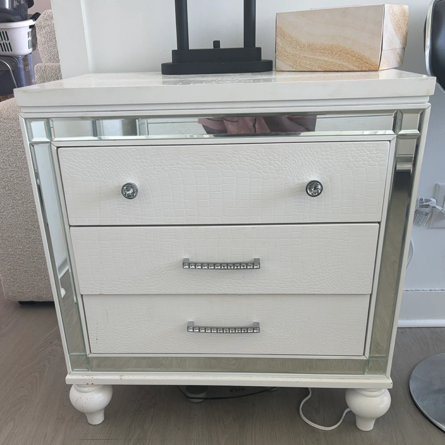 Selling a charming white nightstand with mirrored accents! It features three drawers, perfect for bedside storage. The drawers have a textured finish and stylish knobs. There are some signs of wear near the bottom, but overall it's in good condition and adds a touch of elegance to any bedroom