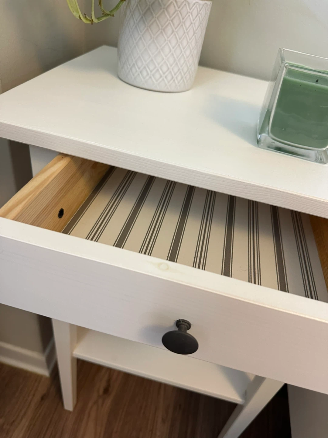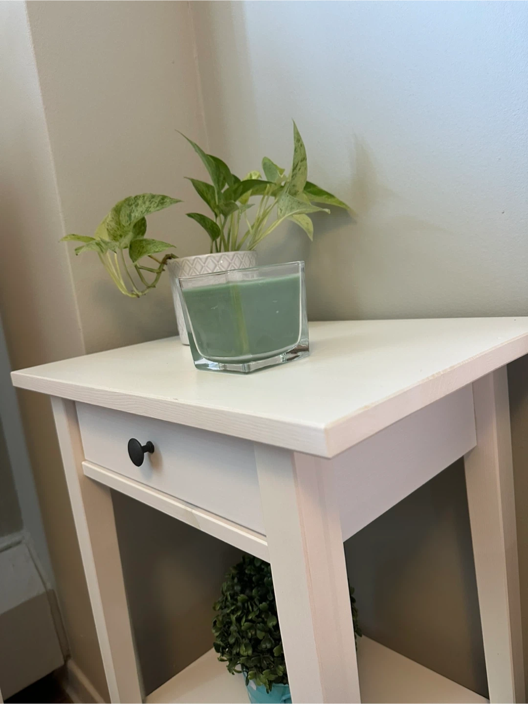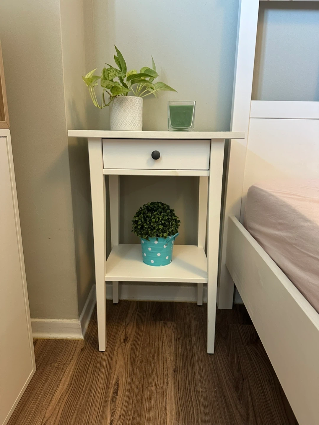 Selling a cute white nightstand for your room. It has a drawer for storage and a shelf underneath. It's in good condition and would look great in any bedroom. Made of wood, with a metal knob. The unit has a white matte finish. There’s a minor scratch on the top edge, you can see that on the pictures. Brand: IKEA Model: HEMNES Original Price: $79.90 + tax Contact me to make this one yours. 👍🏻