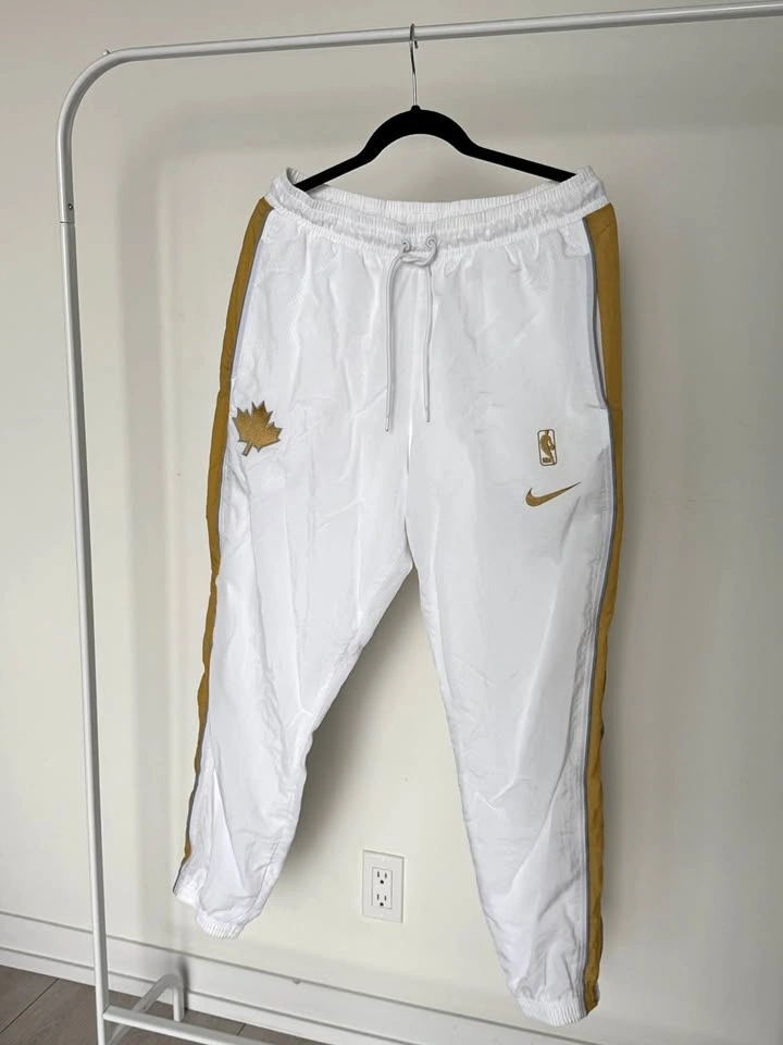 62Great condition white Nike NBA pants with gold accents! Has a drawstring waist and elastic cuffs. Size Large. Made in Vietnam.